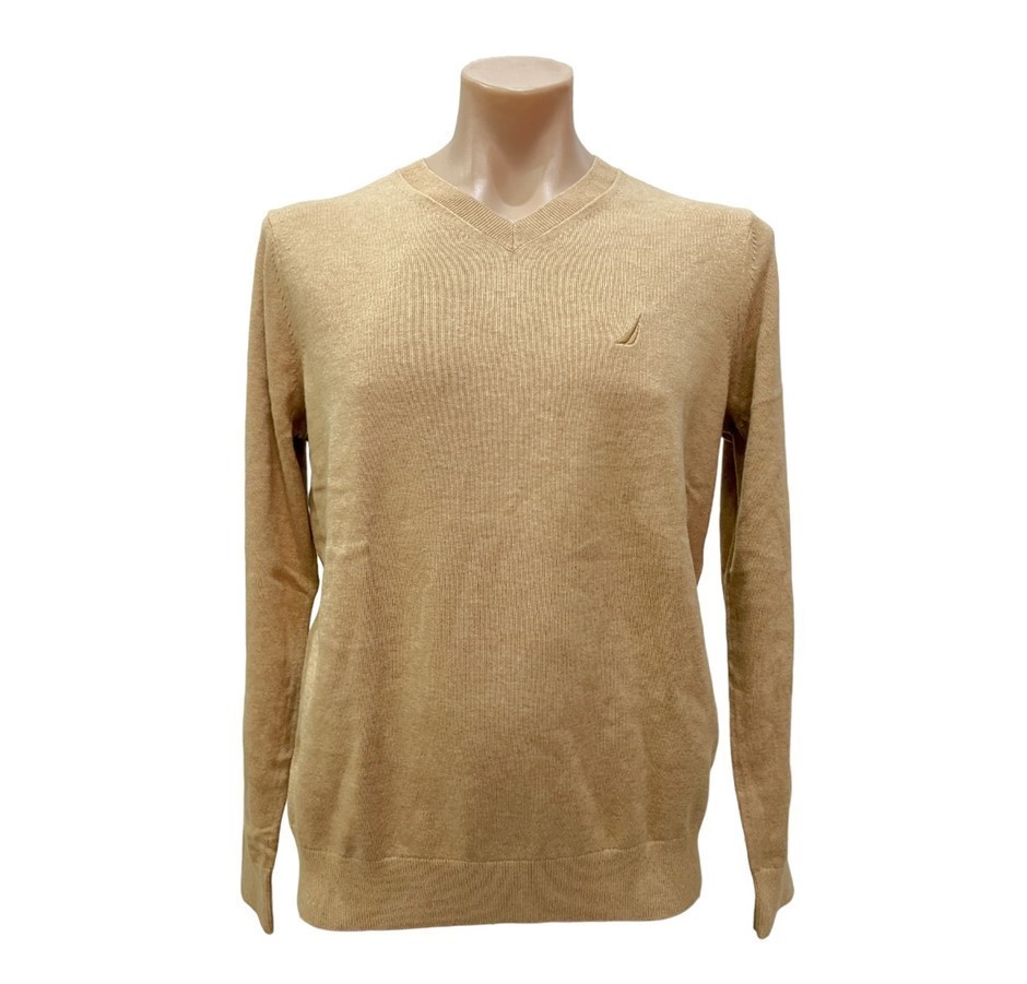 NAUTICA Men's Knit V-Neck Sweater, Size L, 100% Cotton, Coastal Camel Heath