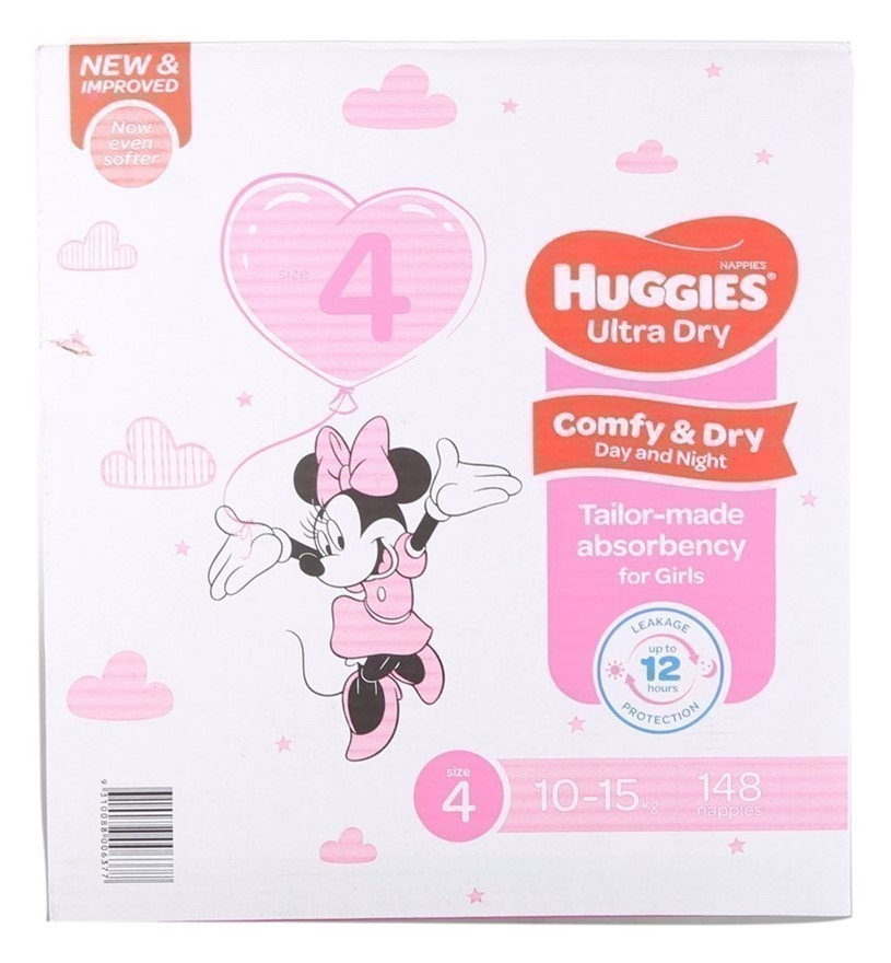 HUGGIES 148pk Ultra Dry Nappies For Girls, Size 4, 10-15kg, Minnie Mouse. N
