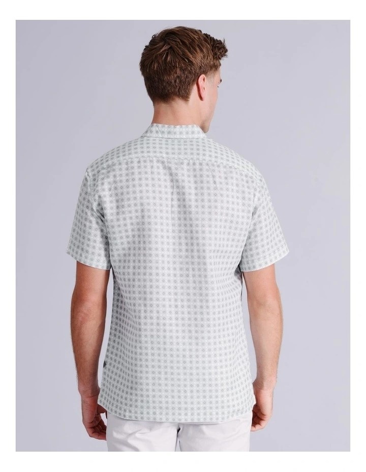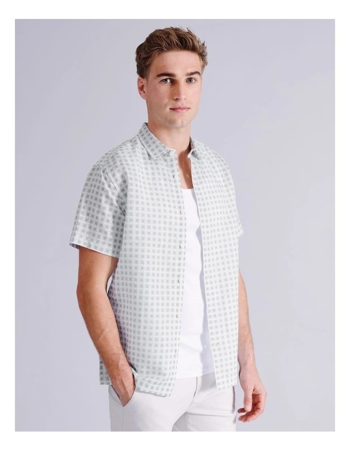 BLAQ Gregory Geo Print Short Sleeve Linen Blend Shirt. Size: L. Colour:Sage