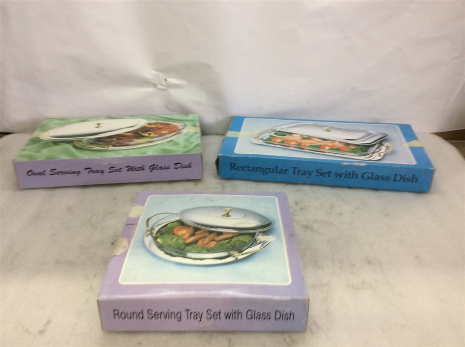 Round Serving Tray Set+Rectangular Tray Set with Glass Dish (Lot of 3)