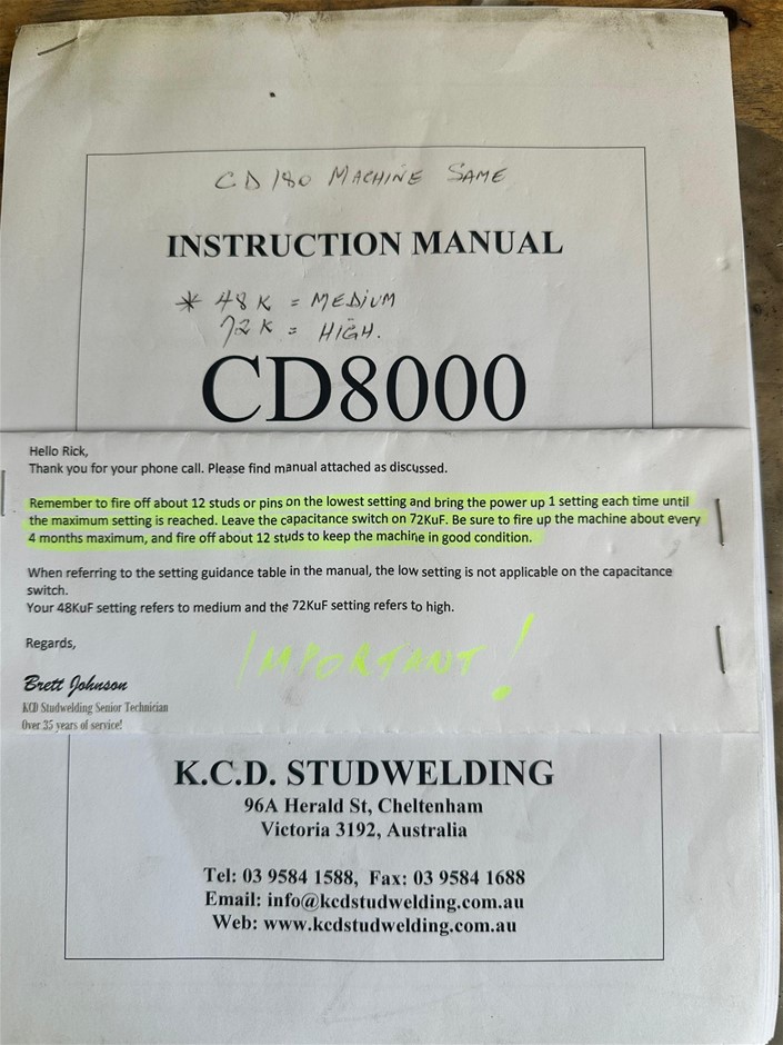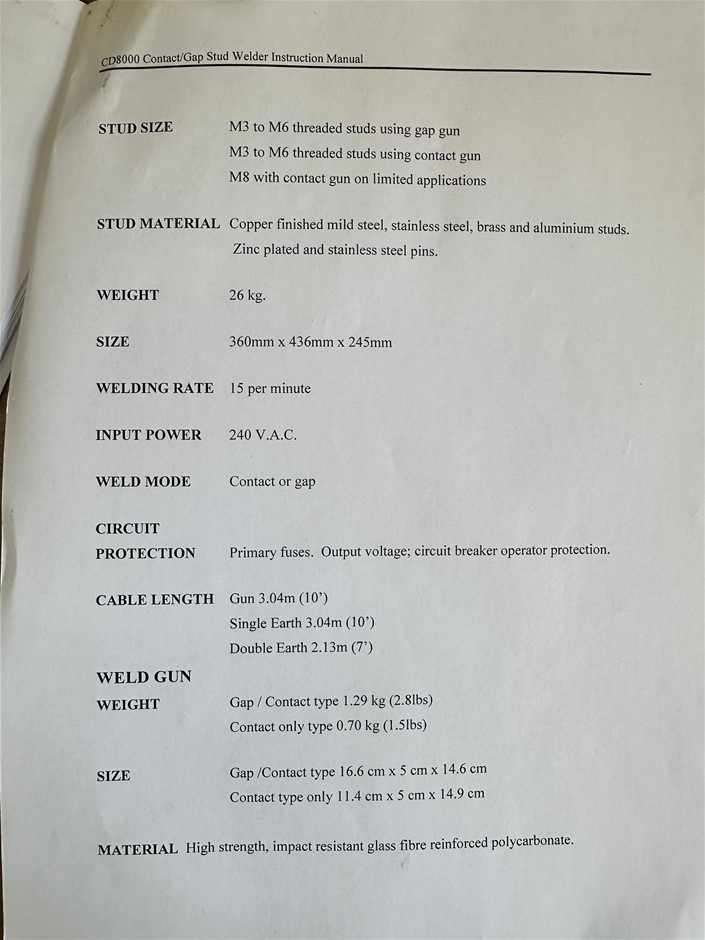 KCD Studwelding Contact/Gap Stud Welder, Model CD8000, 360mm x 436mmx245mm Welding Rate 15 per min Power 240V.A.C - OLD EQUIPMENT / NOT TESTED