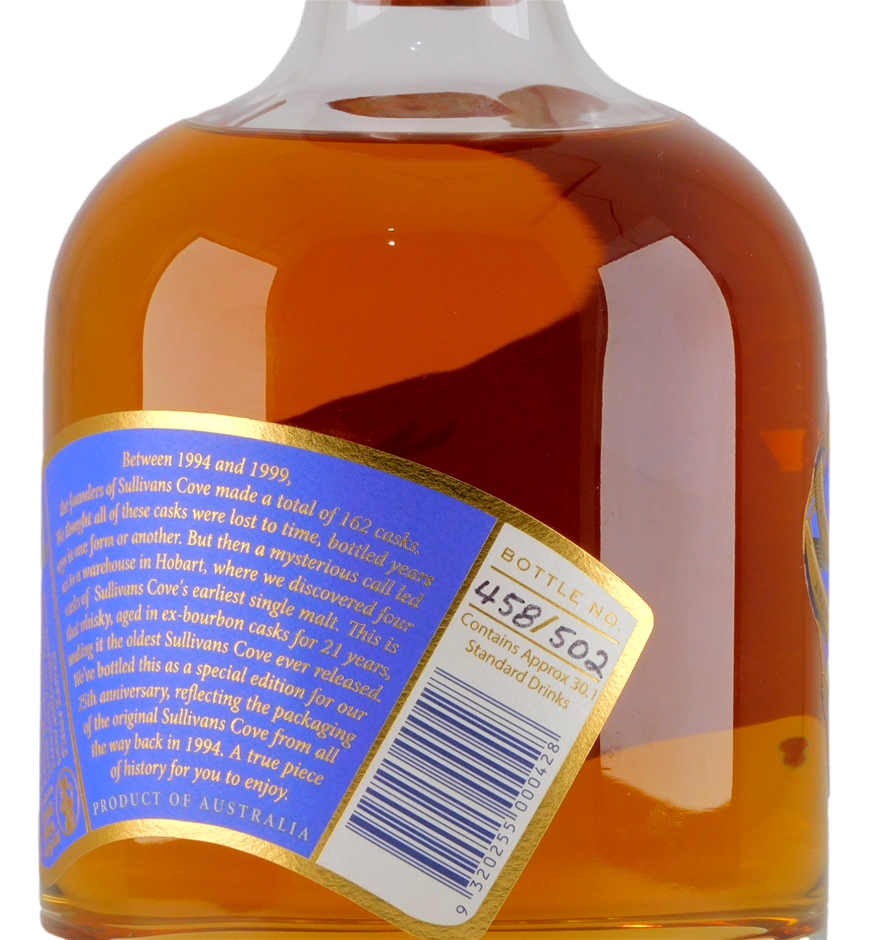 Aged in ex-Bourbon casks for 21 years. Long thought lost, these four casks were bottled to celebrate Sullivans Coves 25th Anniversary