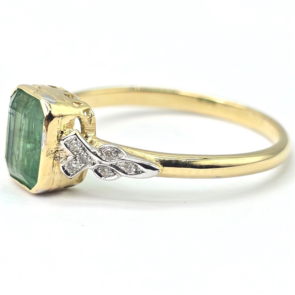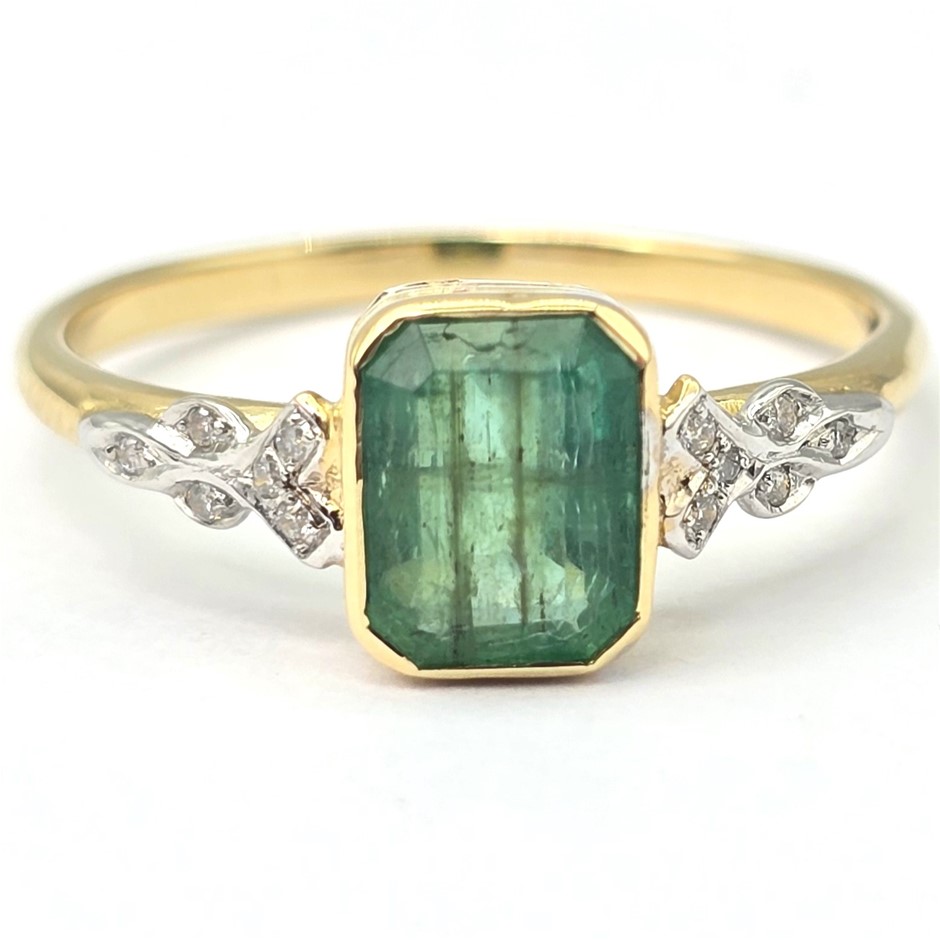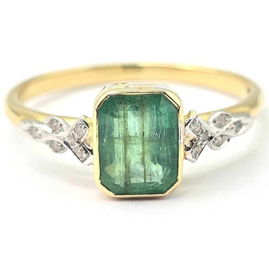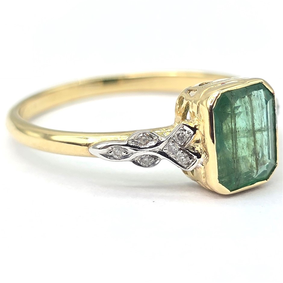 9CT YELLOW GOLD, 1.34TCW DIAMOND & EMERALD RING