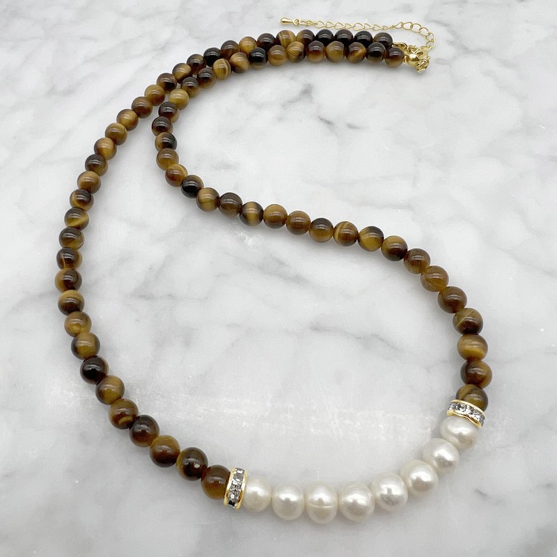 Natural 7-8mm Pearl & Tiger Eye with Real 18k Gold Plated Necklace.
