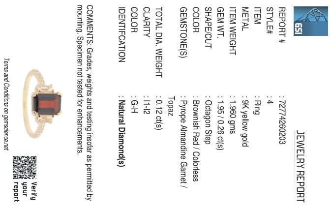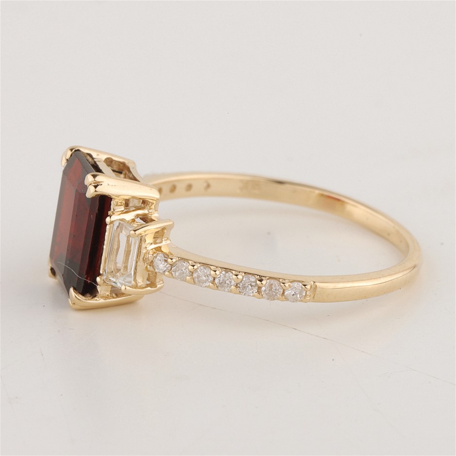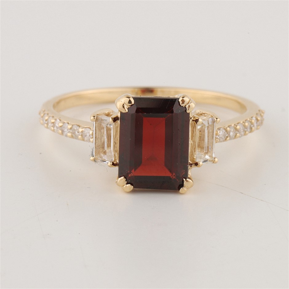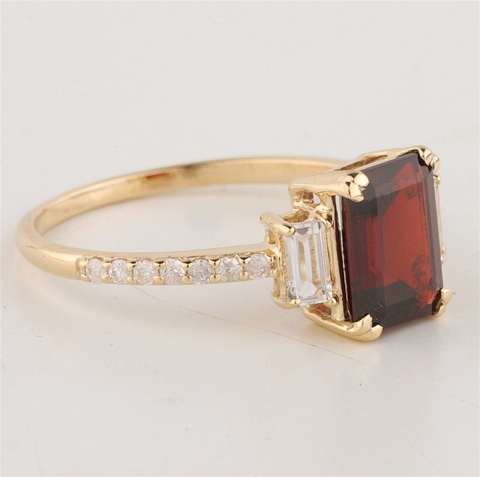 • The Ring consists of (1) Octagon Brilliant Natural Garnet & (2) Octagon Brilliant Cut White Topaz. Surrounding the main stones are Round Brilliant Cut Natural Diamonds.