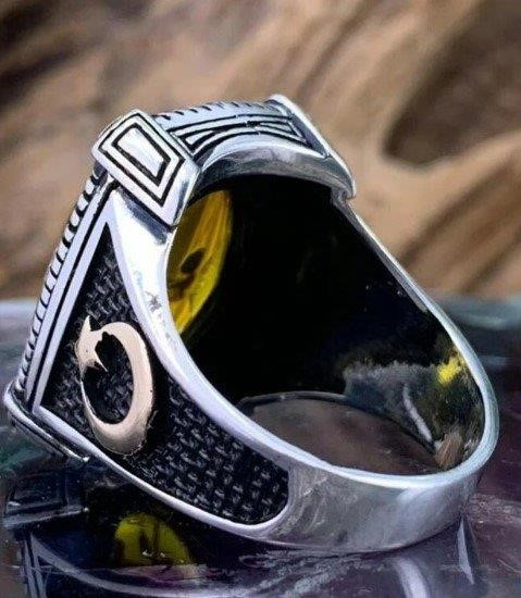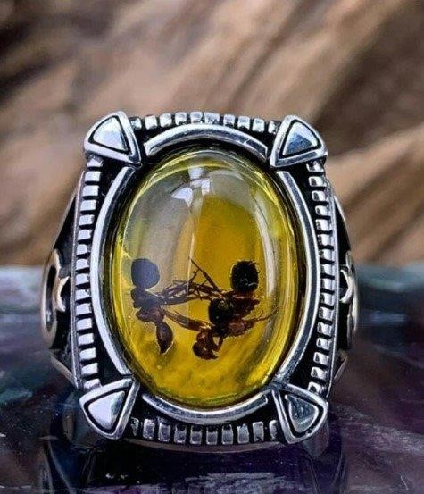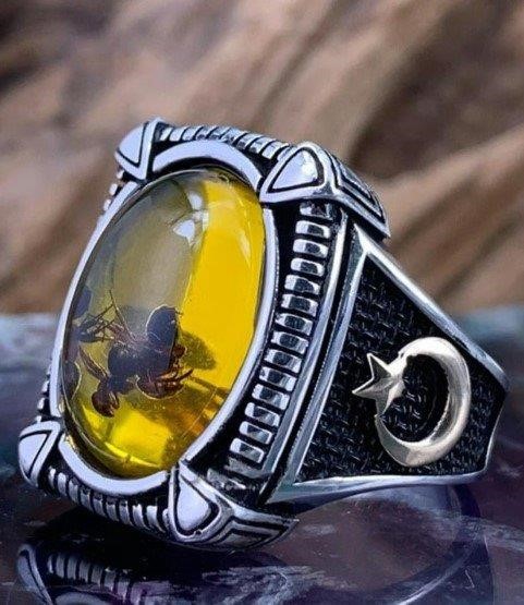Turkish Silver Ring with Yellow Amber and Crescent Moon Design Featuring Preserved Ant