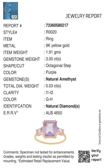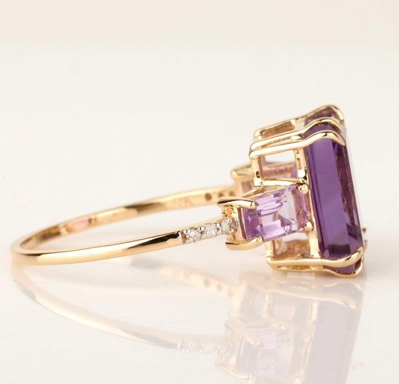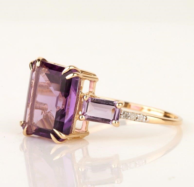 • The Ring consists of (1) Octagon Brilliant Natural Amethyst & (2) Octagon Brilliant Cut Amethyst. Surrounding the main stones are Round Brilliant Cut Natural Diamonds.
