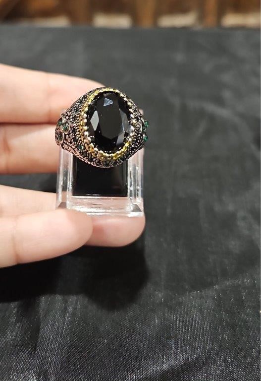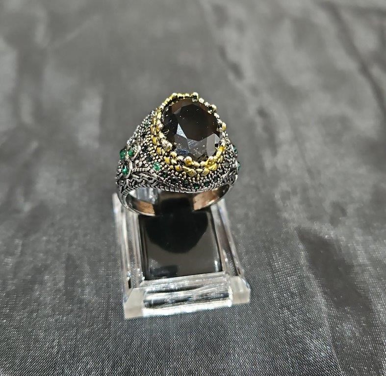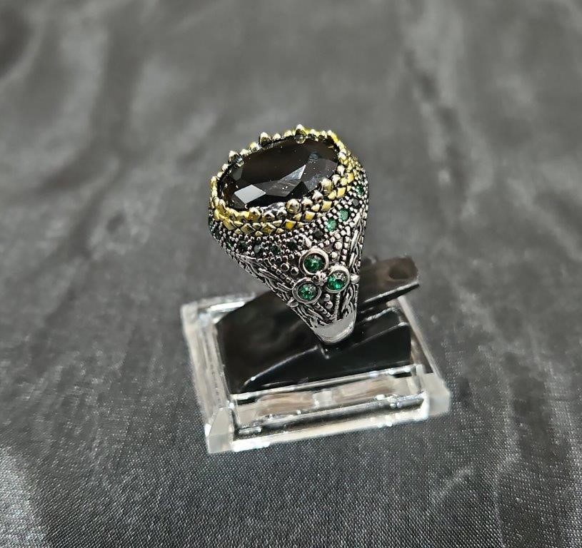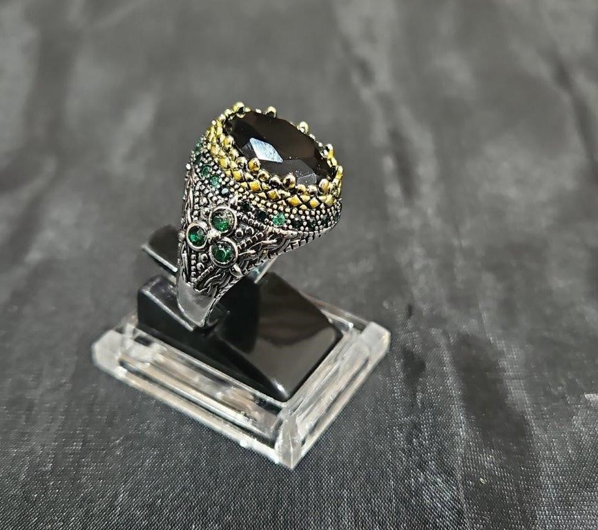 925 Silver Ring with gold accent and Black Onyx and Emerald stones