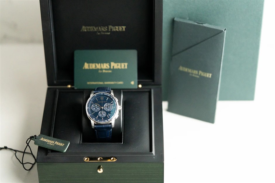 • This Audemars Piguet Code 11.59 Chronograph features a luxurious 41mm white gold case, a sophisticated blue dial, and an elegant leather strap, making it the perfect blend of contemporary design and timeless appeal. Powered by the in-house AP Caliber 4401 automatic movement, it ensures precision and reliability.