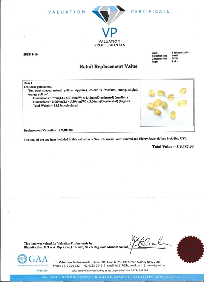 The Certificate of Authenticity means that the actual item for sale has been assessed by a fully qualified specialist jewellery valuer. The specialist jewellery valuer requires knowledge of gemmology, jewellery manufacture, precious metal markets, world gem markets, supply and demand factors both overseas and within Australia, taxation law requirements, general retail practices and the final combination of all the above factors in the principle and procedures of a jewellery valuation. They inspect and assess the jewellery item using a hand lens taking note of several key factors-