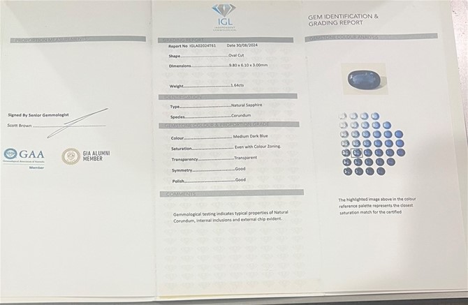 1.64 carat Dark blue natural Sapphire certified