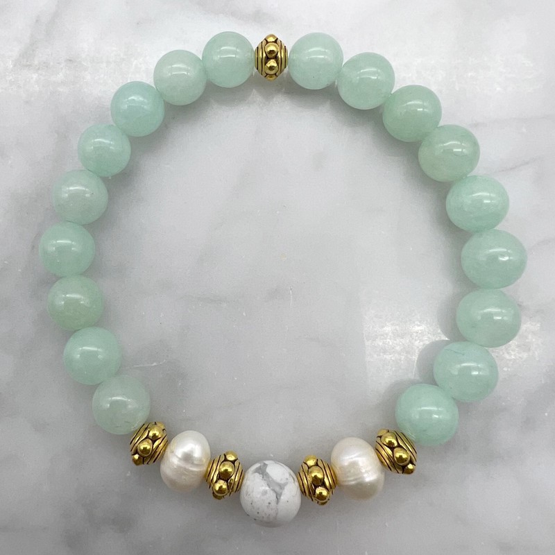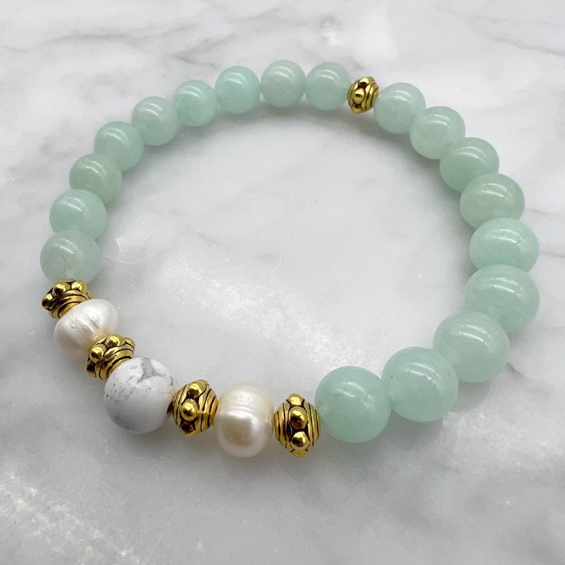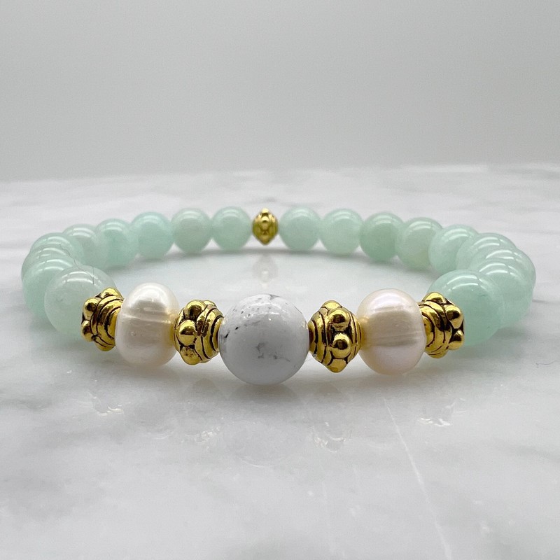 Natural Aqua Malaysia Jade `Quartz`, Howlite, Freshwater & Antique Gold Spacers Beaded Bracelet