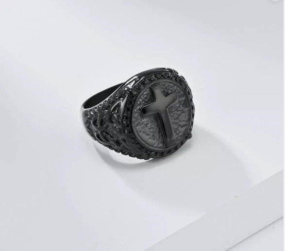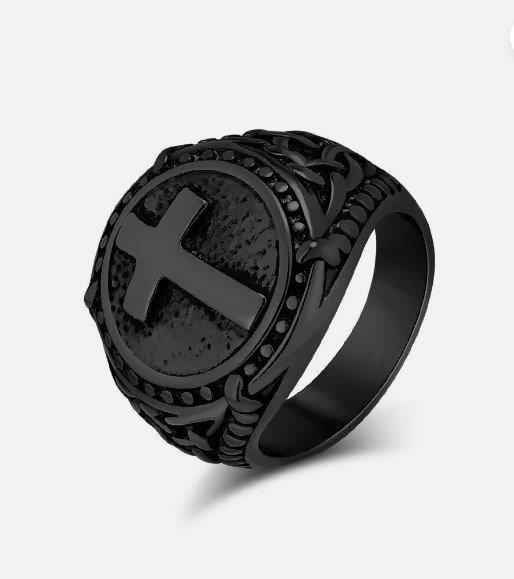 • Make a bold statement with this striking black matte ring, featuring a prominent cross medallion. With its unique finish and intricate design, this piece is a powerful symbol of faith and individuality.