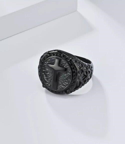 Black Matte Cross Medallion Ring with Intricate Detailing-11US