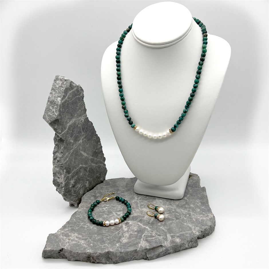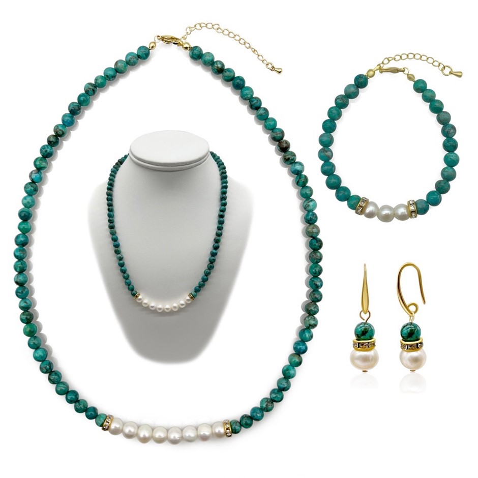 Natural 7-8mm Freshwater Pearl & African Jasper `Turquoise` with Real 18k Gold Plated Necklace, Bracelet & Earring Set