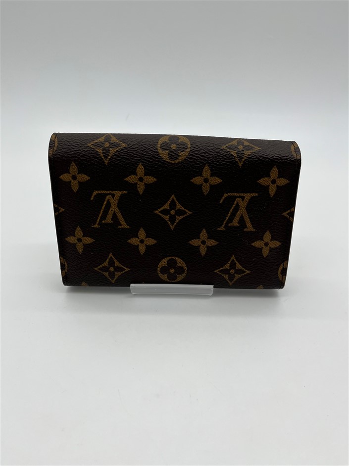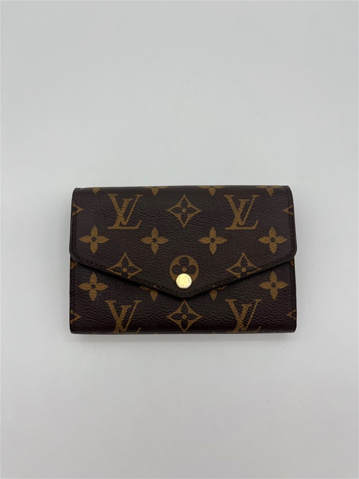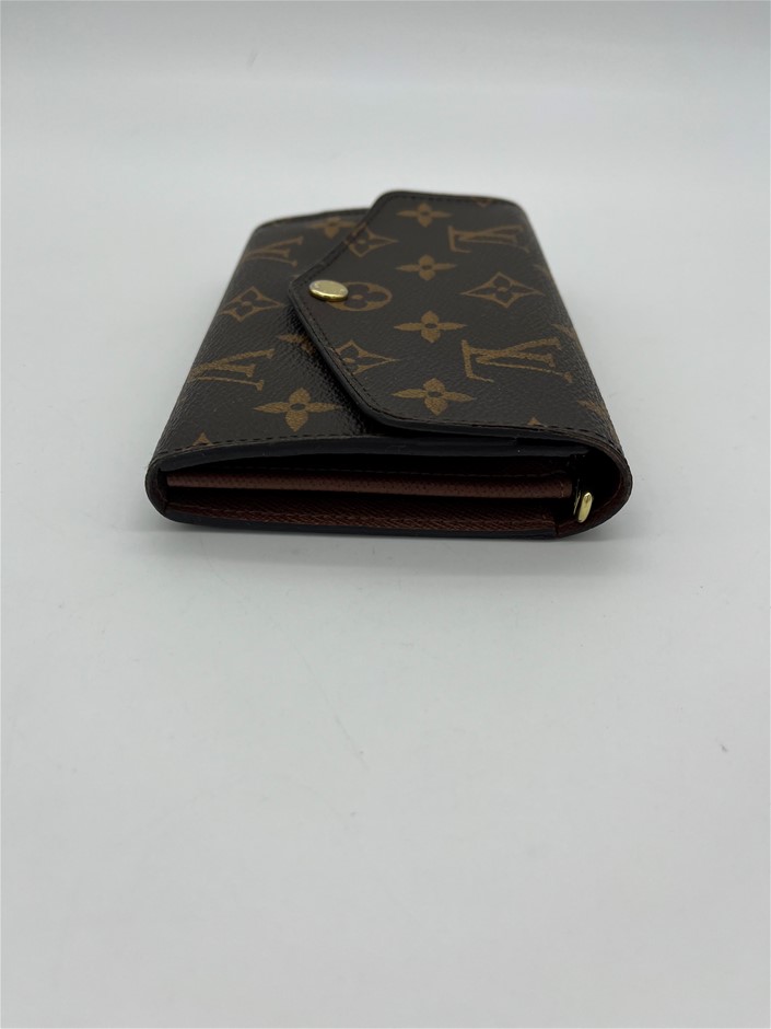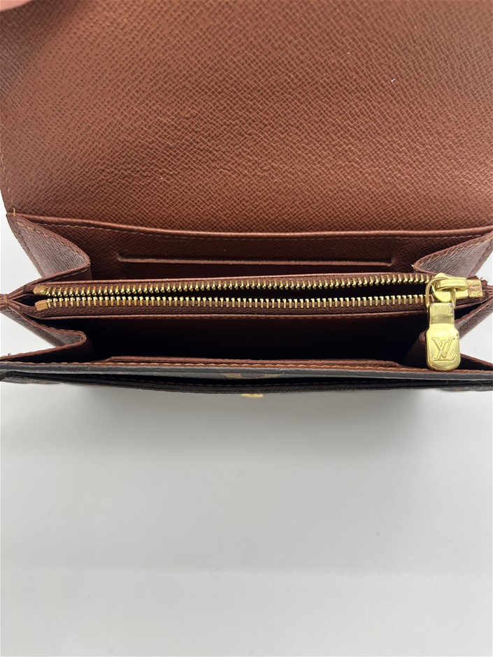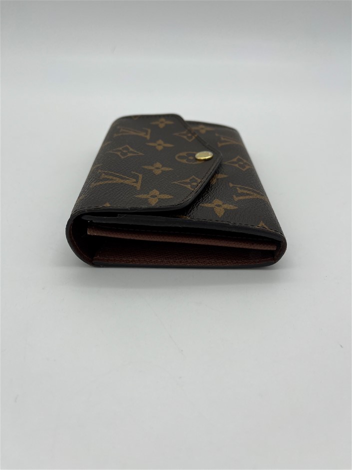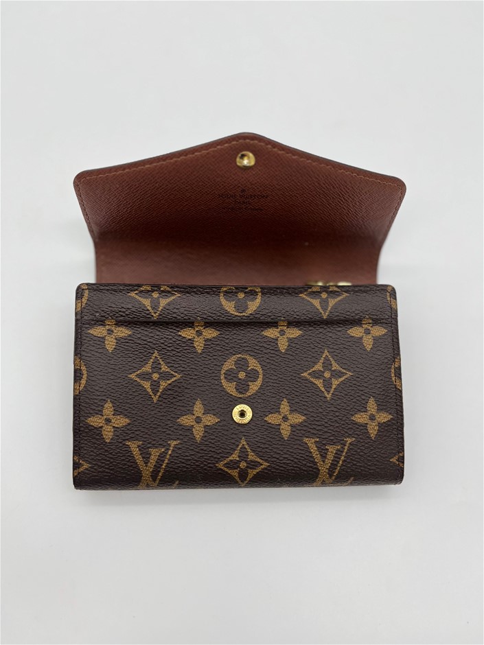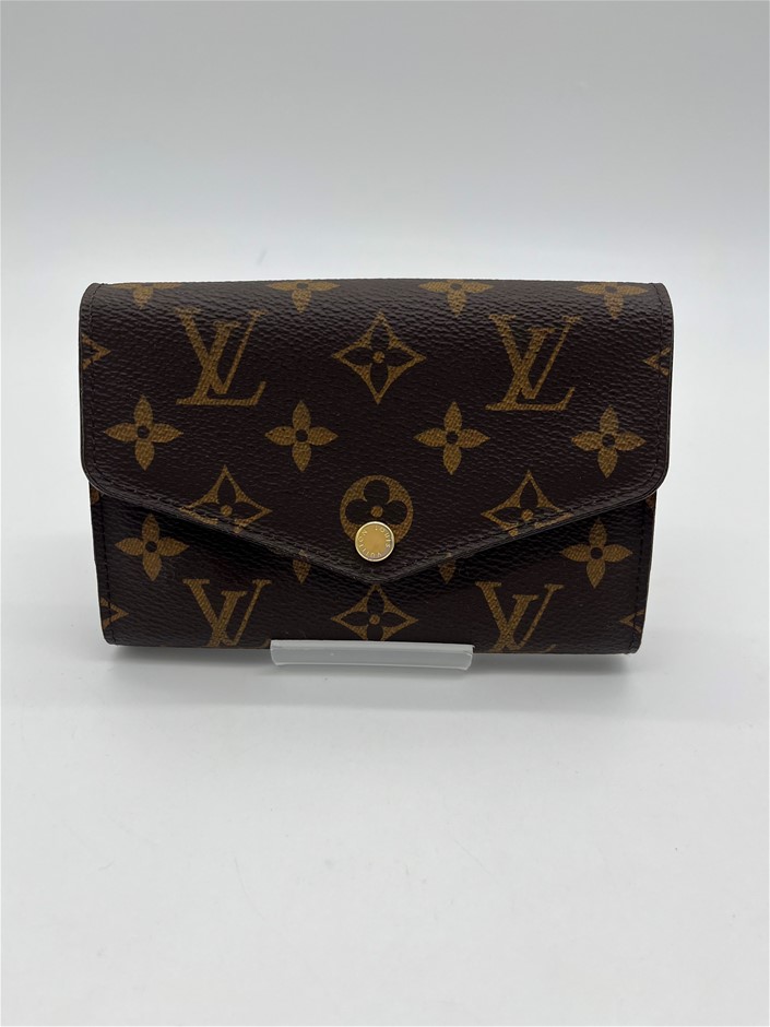 This is a used and preloved Louis Vuitton Monogram Sarah Wallet canvas with a grained-leather lining, offering an elegant envelope design. It features two large compartments, a central zipped coin pocket, 16 card slots, and multiple pockets for organized storage. With a gold-tone press-stud closure, this wallet provides a stylish and practical way to keep essentials secure.