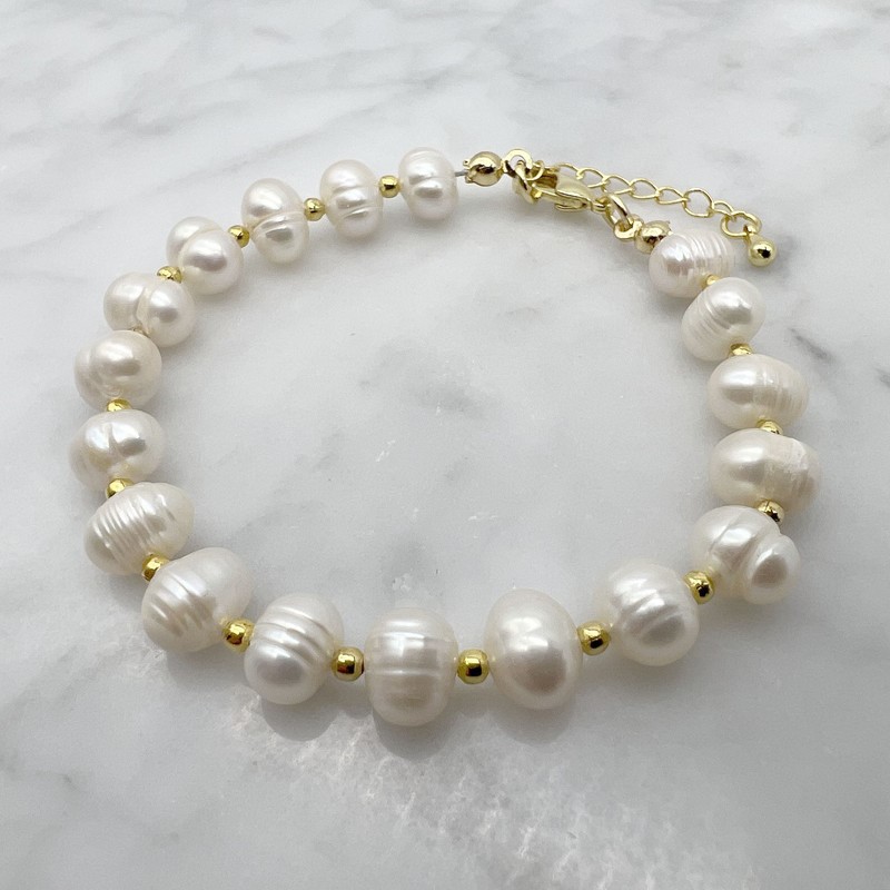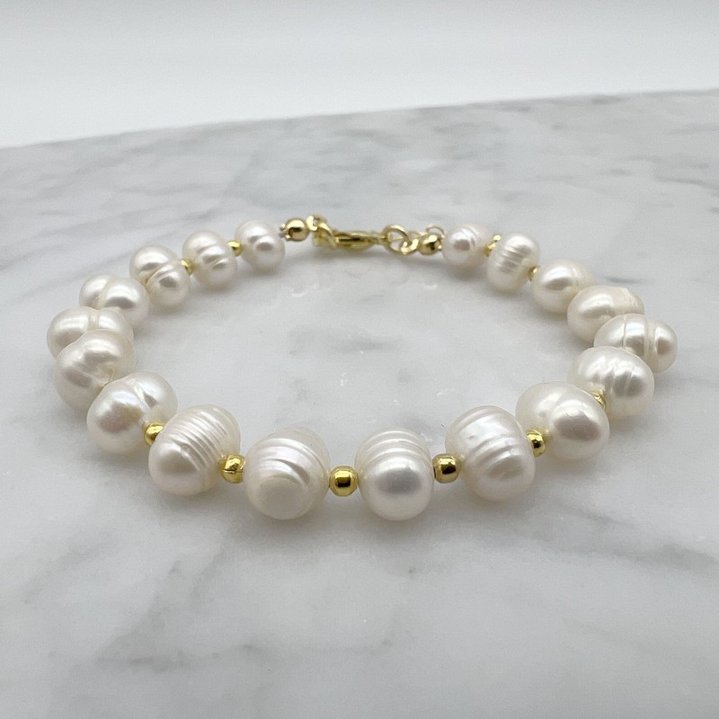 Natural 7-8mm White Freshwater Pearls & Spacer Beads 18k Gold Plated Bracelet.
