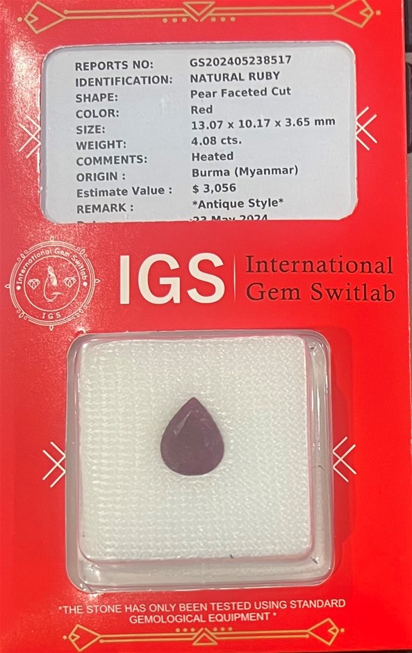 4.08 carat Natural Burma Red Ruby Pear Shaped Certified