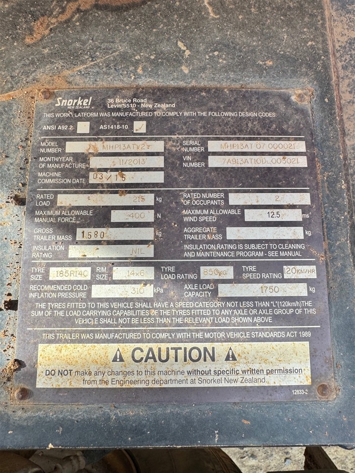 2015 SNORKEL MHP13AT Trailer Mounted Boom - 35ft (10.9m) (Moranbah)