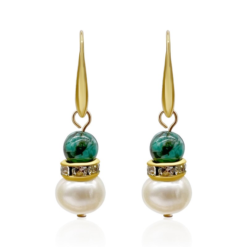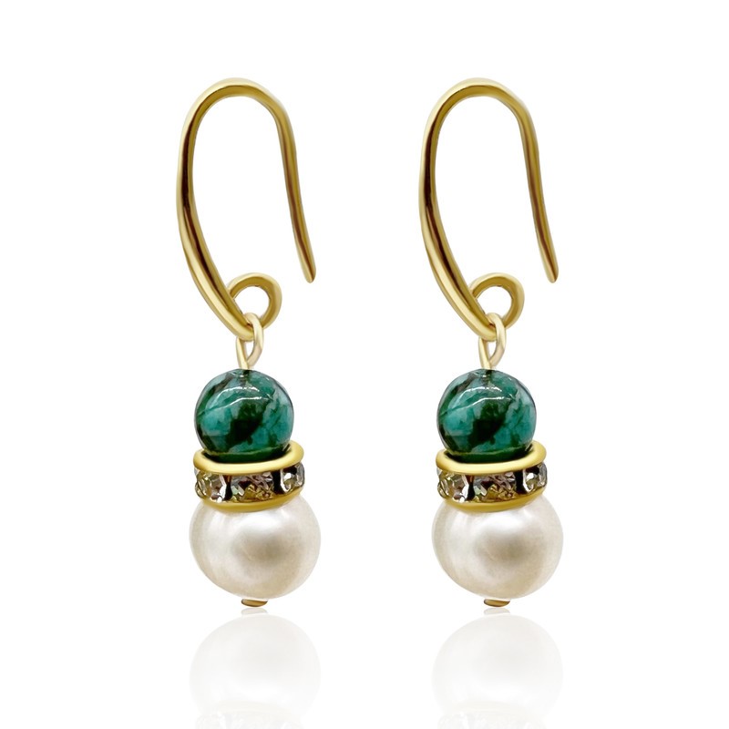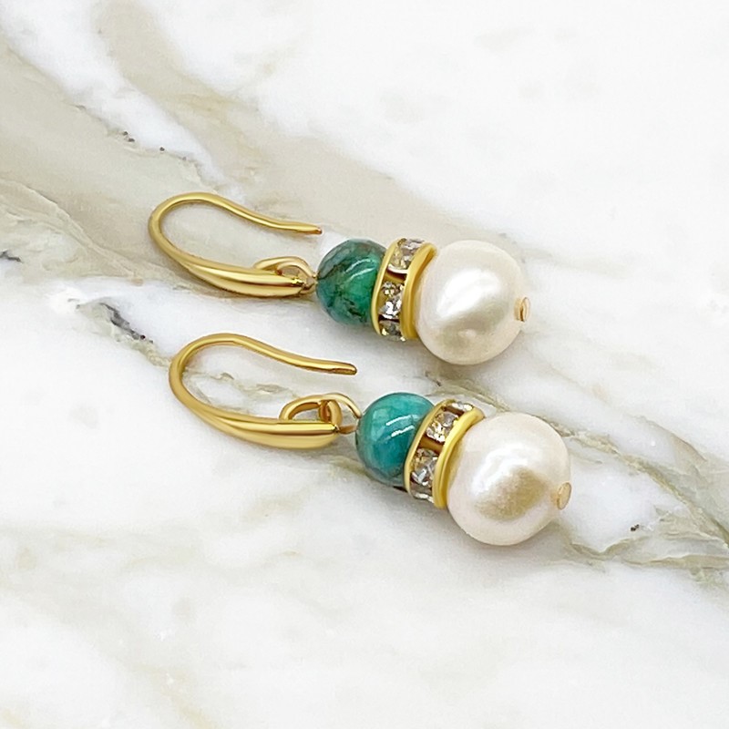 African Jasper `Turquoise` & Freshwater Pearl Rhinestones Gold Plated Drop Earrings.