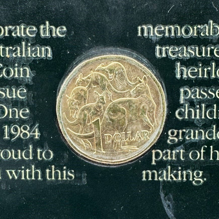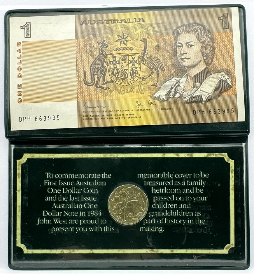 JOHN WEST AUSTRLIAN FIRST ISSUE 1984 $1 COIN & LAST ISSUE 1984 $1 NOTE IN DISPLAY FOLDER