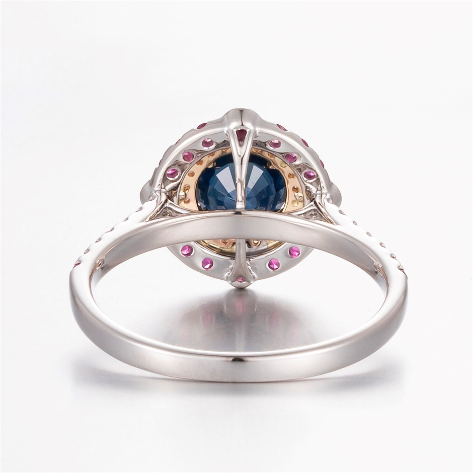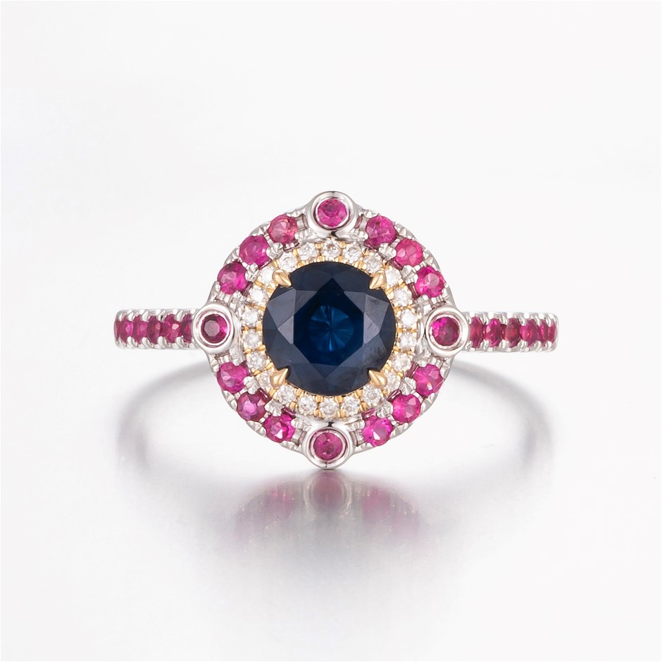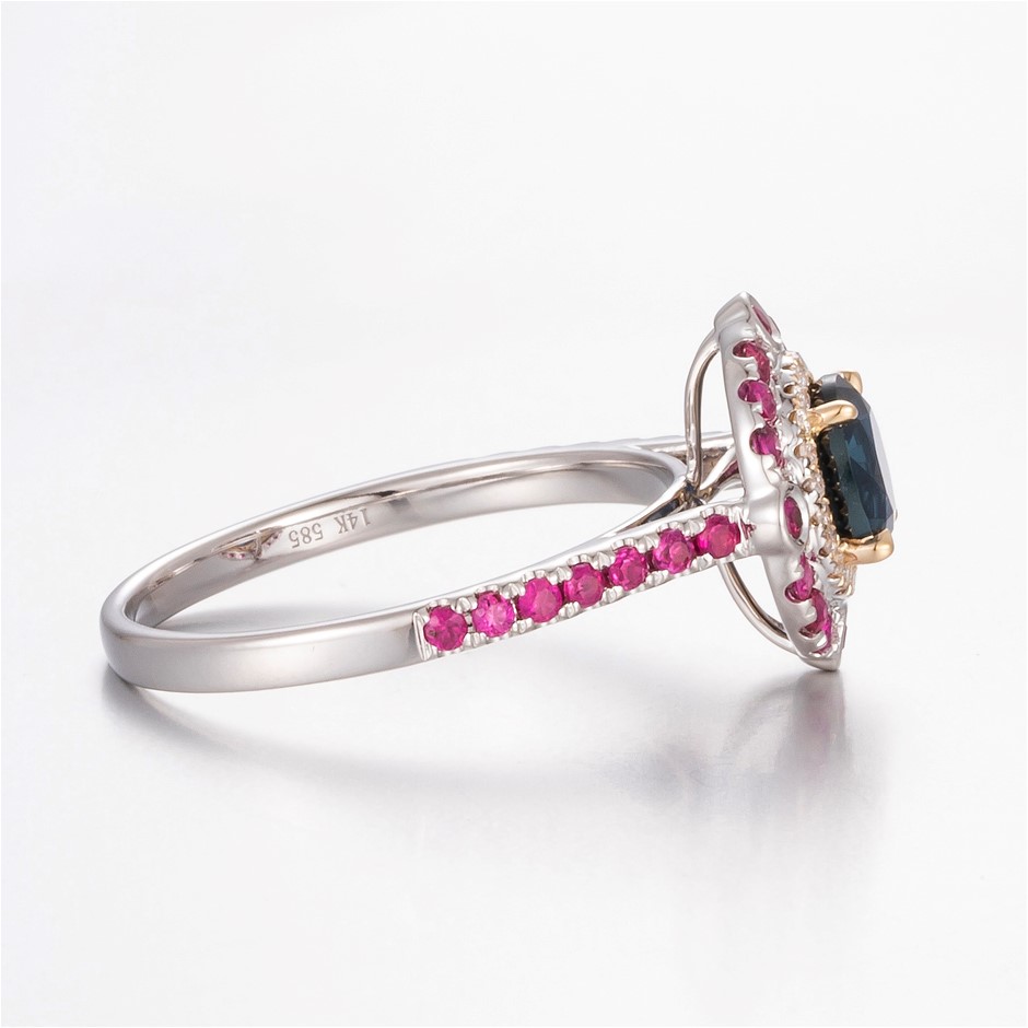 14CT White Gold Australian Sapphire, Diamond and Ruby Antique Style Ring