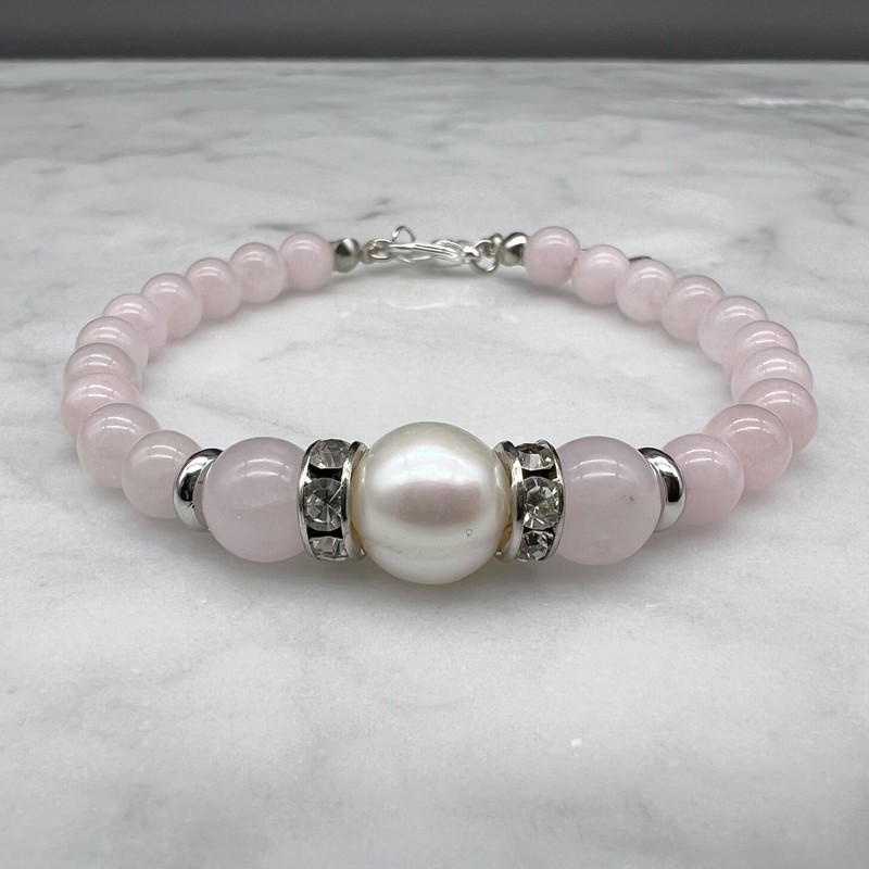 Rose Quartz with 9-10mm Pearl & Rhinestone Platinum Plated Bracelet.