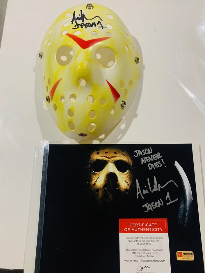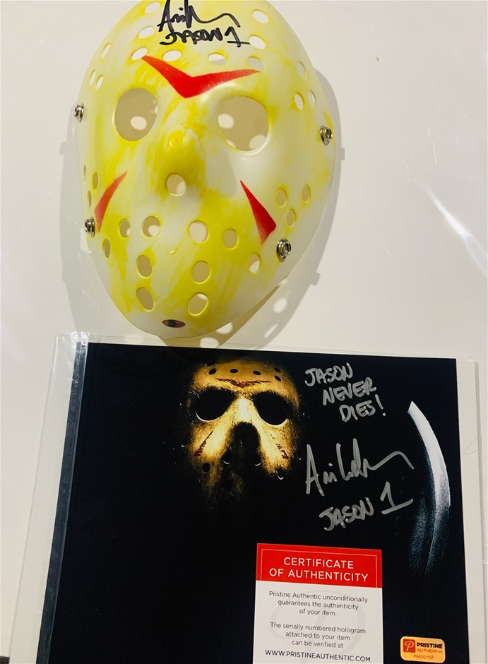 Hand-signed and inscribed by Ari Lehman (Jason Voorhees - original Jason Friday the 13th 1977) Full size Hockey Mask and Photo both signed and featuring several inscriptions between them. The lot includes individual tamper proof numbered and traceable holograms from Pristine and OKAuthentics along with a certificate of authenticity for authenticity purposes.