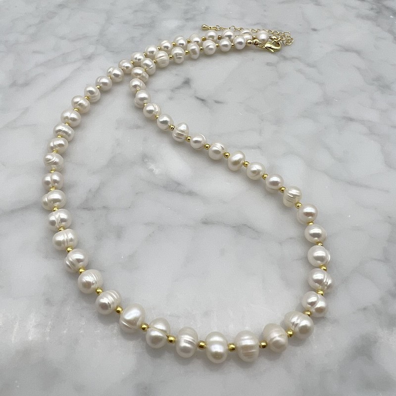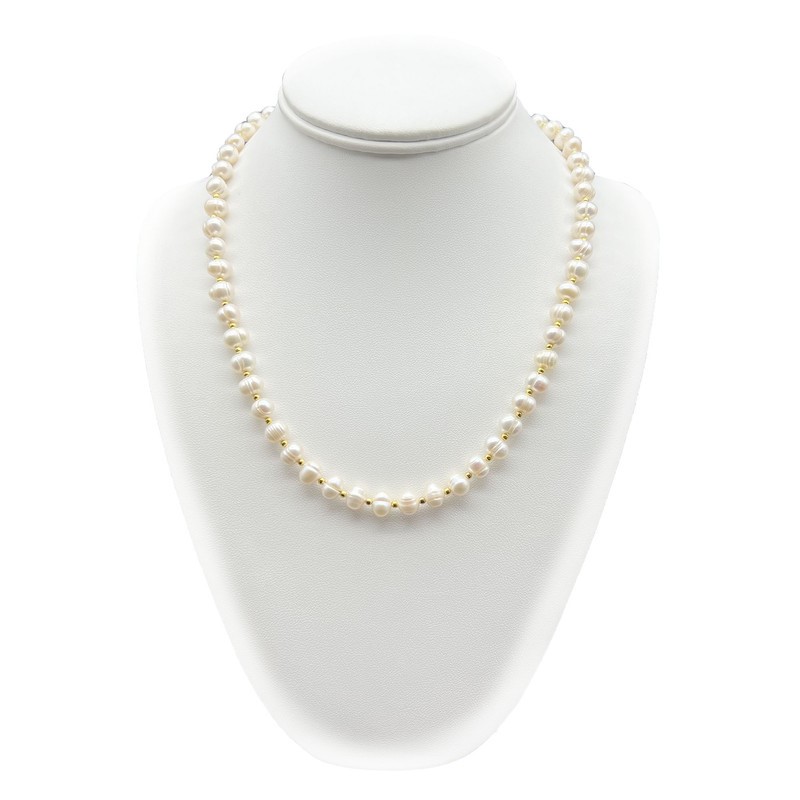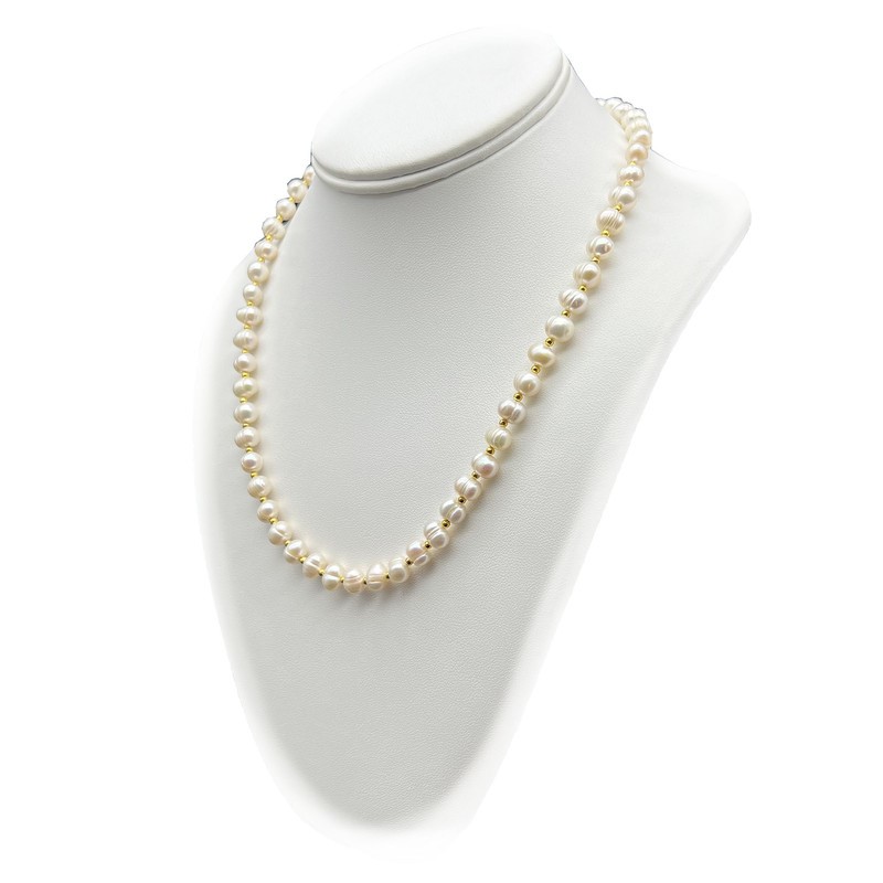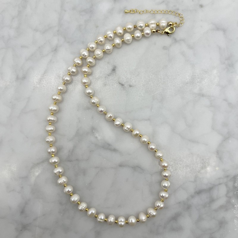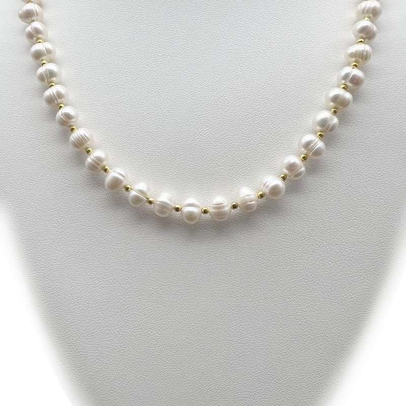 Natural 7-8mm White Freshwater Pearls & Spacer Beads 18k Gold Plated Necklace.
