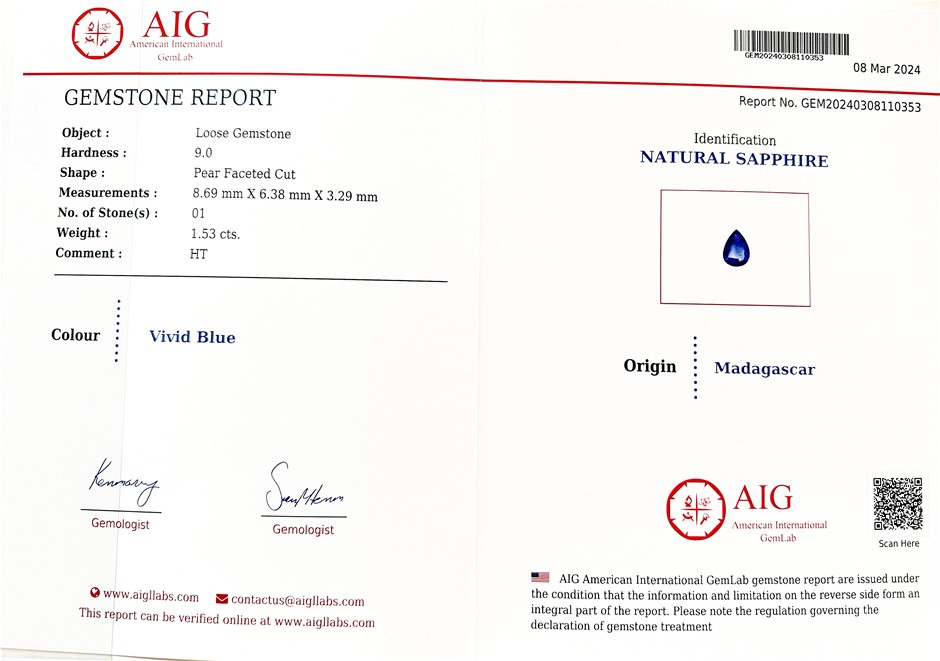 1.53 Carats Natural Blue Sapphire