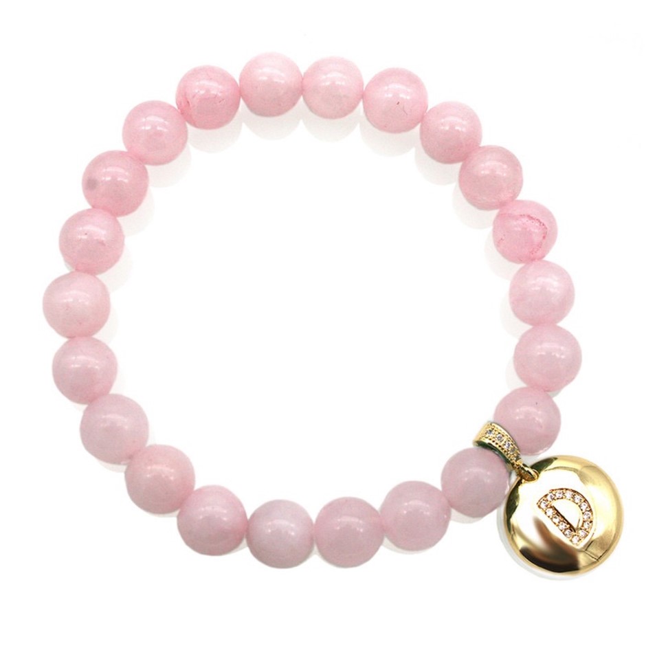 Natural Round Rose Quartz & Personalized Letter `D` Gold Plated with CZ Fine Jewelry Beads Stretch Bracelet