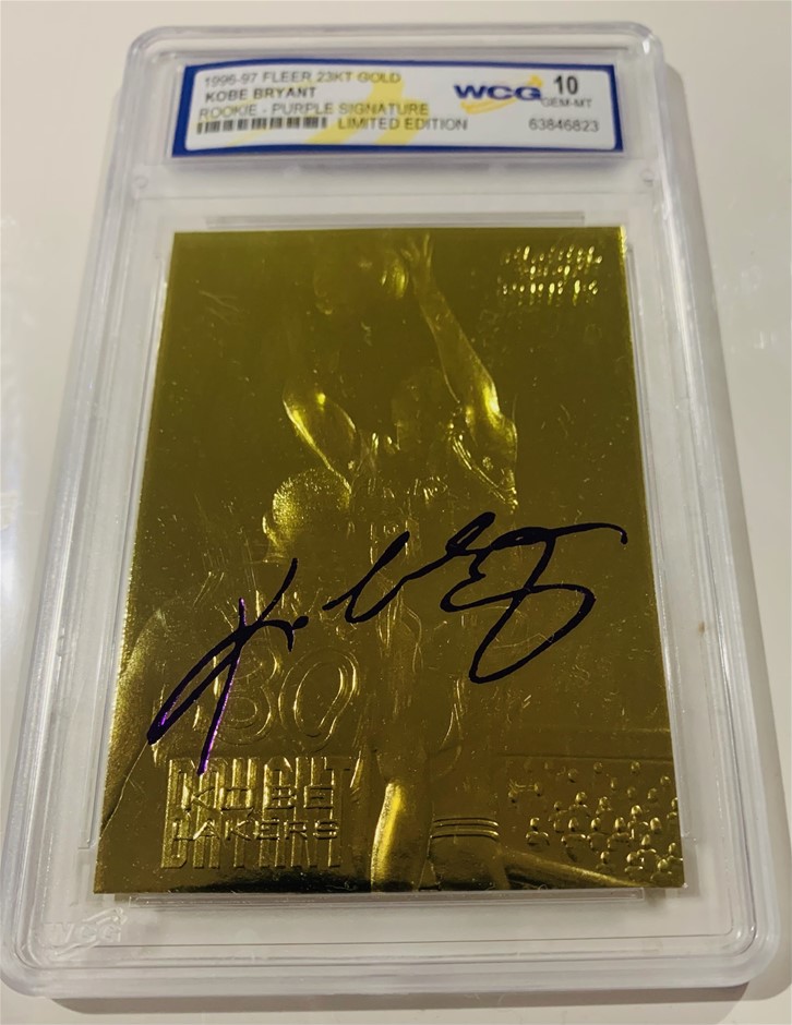 Kobe Bryant 1996-97 Fleer 23Kt Gold Purple Facsimile RC / `96-97 E-X2000. Graded and encapsulated WCG 10 MintCard is done in 23 Kt Gold and individually numbered please see images for further details.