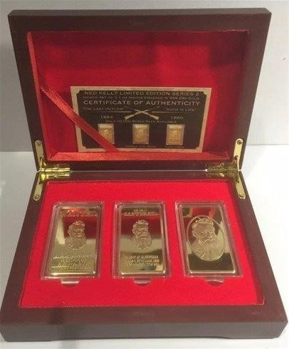 NED KELLY Set of 3 x 1oz Ingots With Box 999 24k Gold Plated