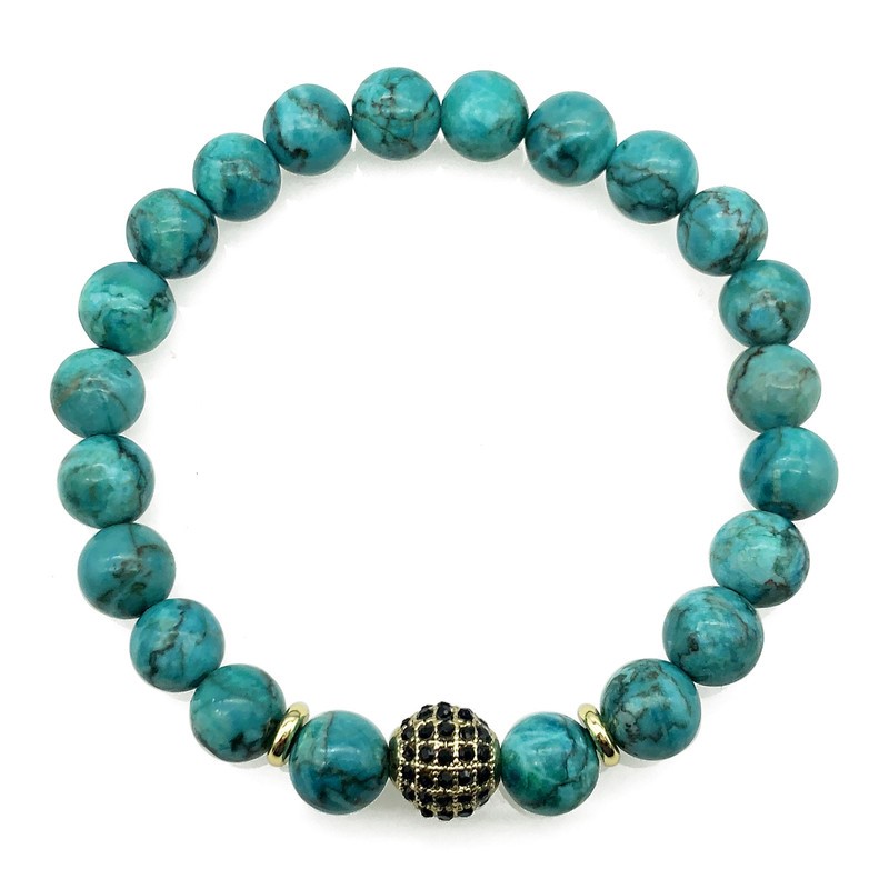 Men`s 8mm African Jasper `Turquoise` & Golden Rhinestone Beaded Gemstone Bracelet.