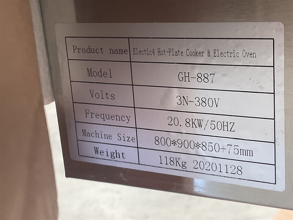 • Comments: Unused 4 Plate Cook Top Oven. Overall 1000 x 900 x 1100mm (h). Use photos as guide only.
