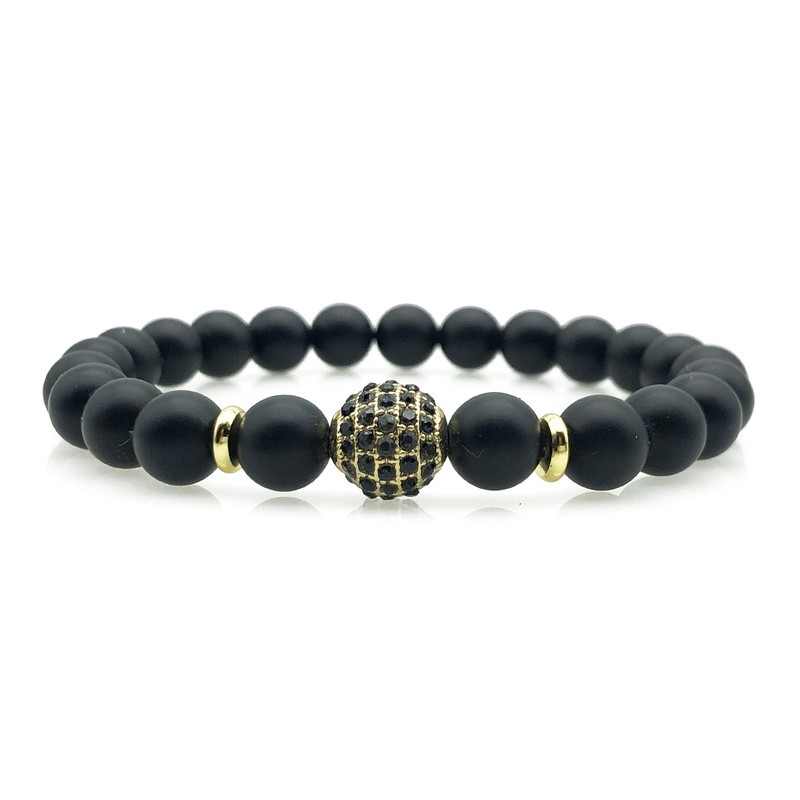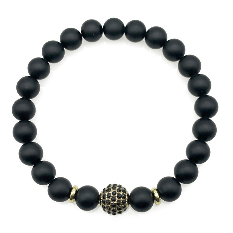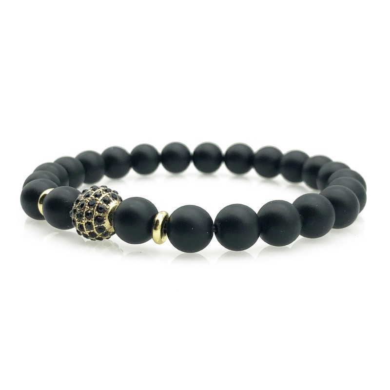 Men`s 8mm Frosted Black Agate & Golden Rhinestone Beaded Gemstone Bracelet.