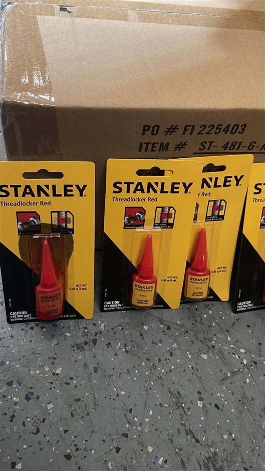 • Carton of Stanley red threadlocker 72 units per carton. Please note some are leaking as shown in picture