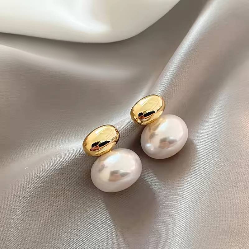 Genuine Simulated White Natural Pearl Oval Drop Earrings in Gold