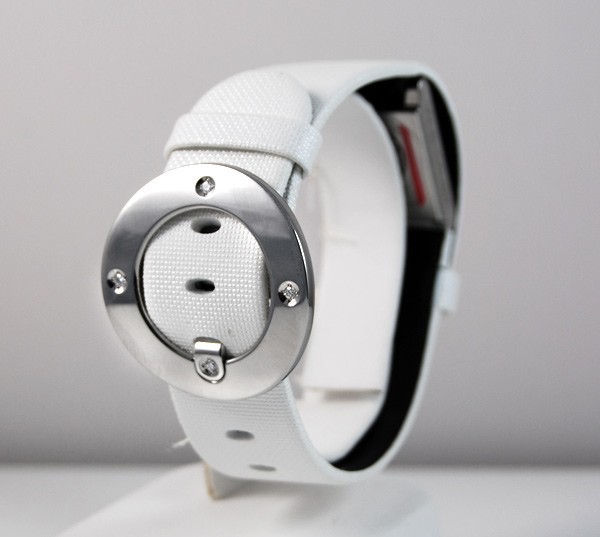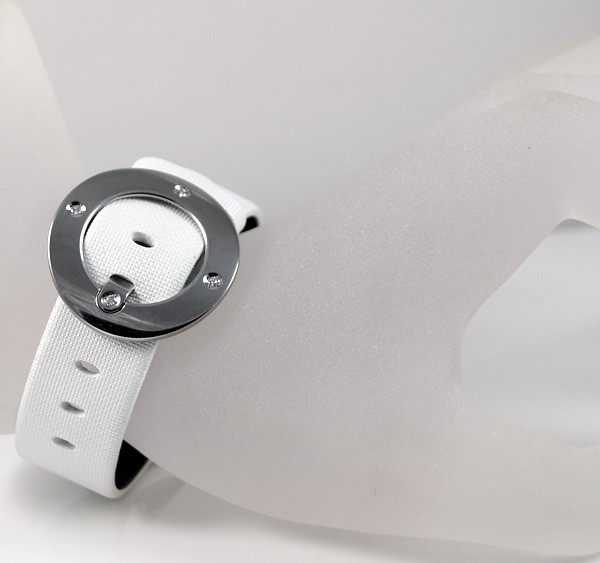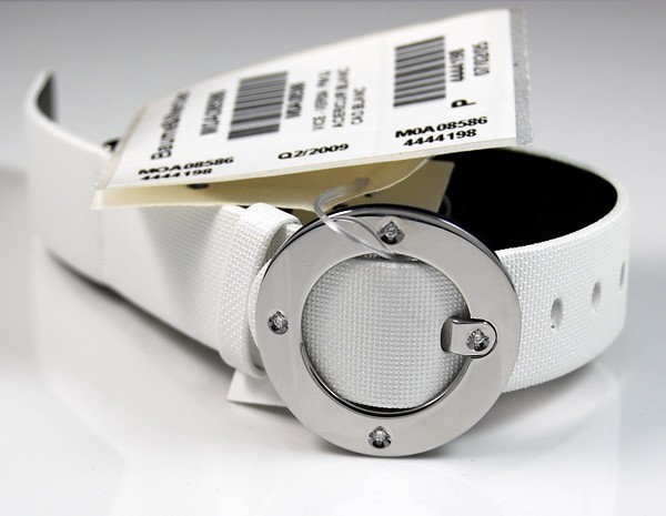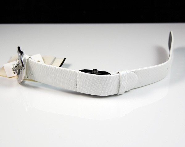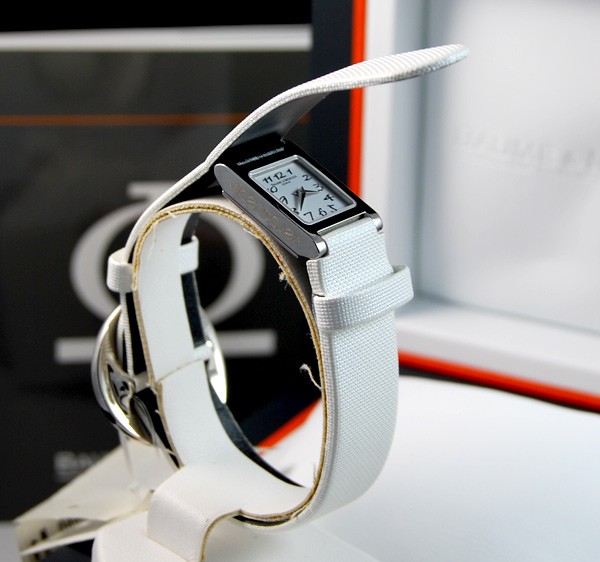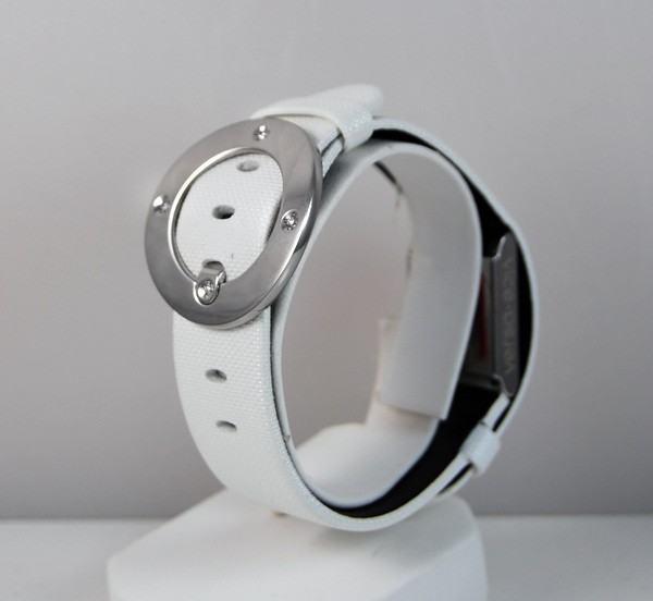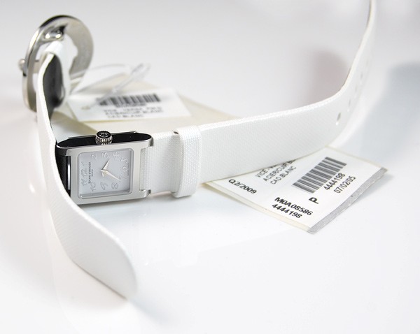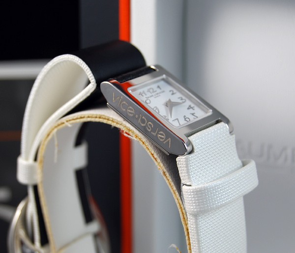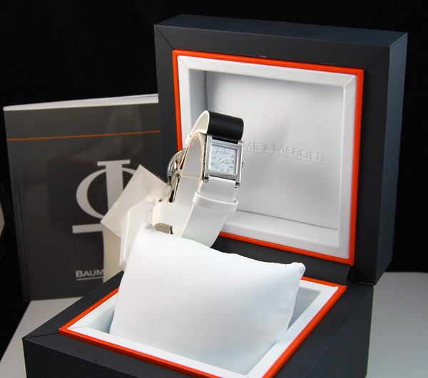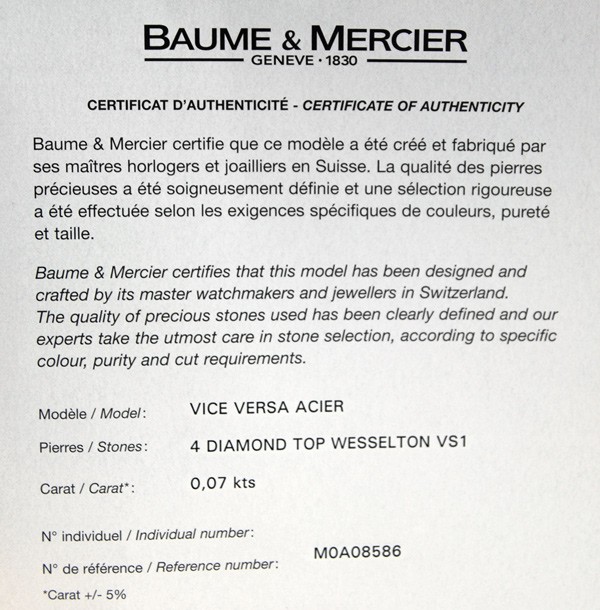 Retail Replacement Value $2300 - One Baume & Mercier "Vice Versa" ladies quartz watch, in stainless steel with white dial. Dial has "Baume & Mercier" & "GENEVE" marked under the 12 o'clock position, "SWISS MADE" under 6 o'clock position, hands are blade type, hour markings are italic arabic numerals, crown has Baume & Mercier logo, side of case marked "vice versa", case back marked, "BAUME & MERCIER", "GENEVE 1830", "SWISS 50M", large Baume & Mercier logo in the centre, "STAINLESS STEEL", "No 4441215", white leather band has Baume & Mercier diamond set buckle 4 diamonds totalling 0.07ct, colour: Top Wesselton, clarity: VS1. This watch is now discontinued and a price for replacement model Ilea supplied by Baume & Mercier used. Condition: New.