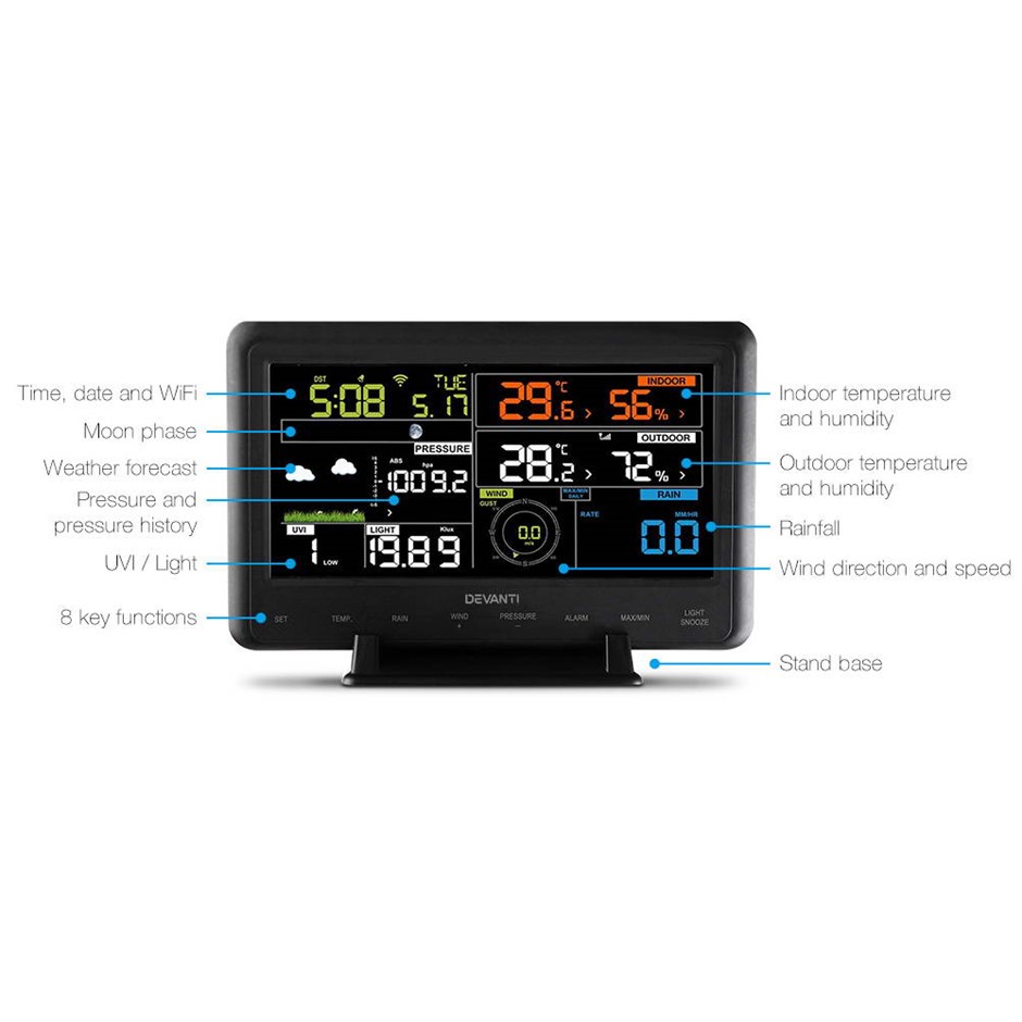 Package Content 1 x Devanti WiFi Professional Weather Station 1 x Outdoor Sensor 1 x Stand Base 1 x Pole 1 x 5V DC Adaptor1 x User Manual