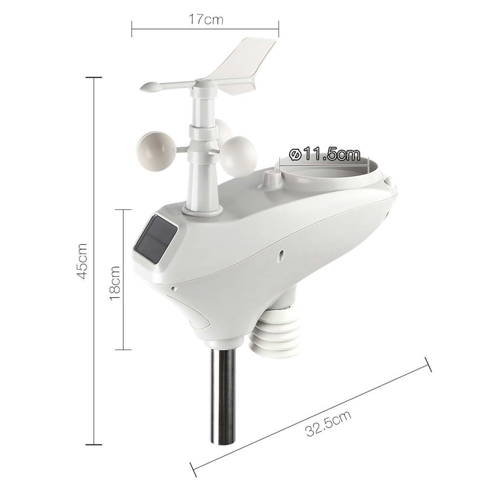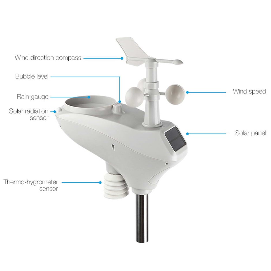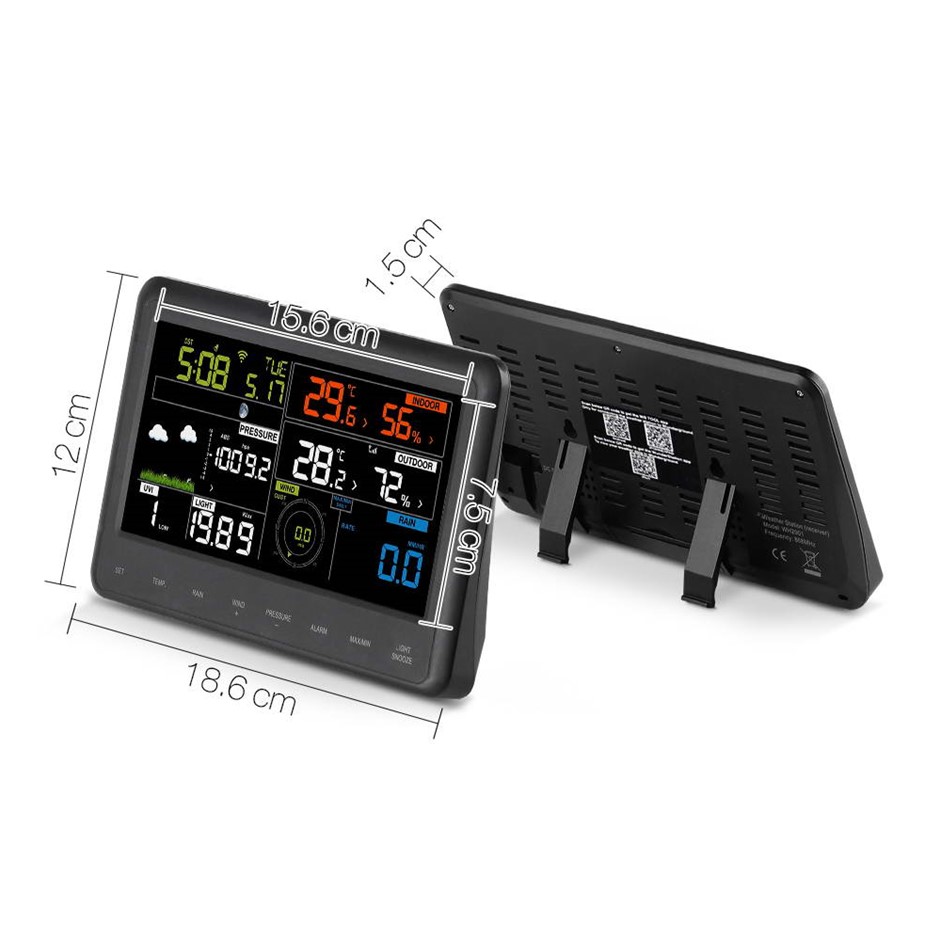 Features * Wireless transmission * Adjustable brightness LCD colour screen * Up to 100m transmission range * Weather forecast * Solar collector * Light and UV index * Moon phases * WI-FI set-up through App * Outdoor and indoor temperature (degrees/ degrees F) * Outdoor and Indoor humidity (% RH) * Wind and rain measurement * Air pressure and air pressure history * Time and date display * Rainfall data (inch / mm) * Wind direction compass (km/h, mph, m/s, knots, Beaufort rating) * Weather data viewing, analyzing and publishing with free PC software * Wall hanging or free standing