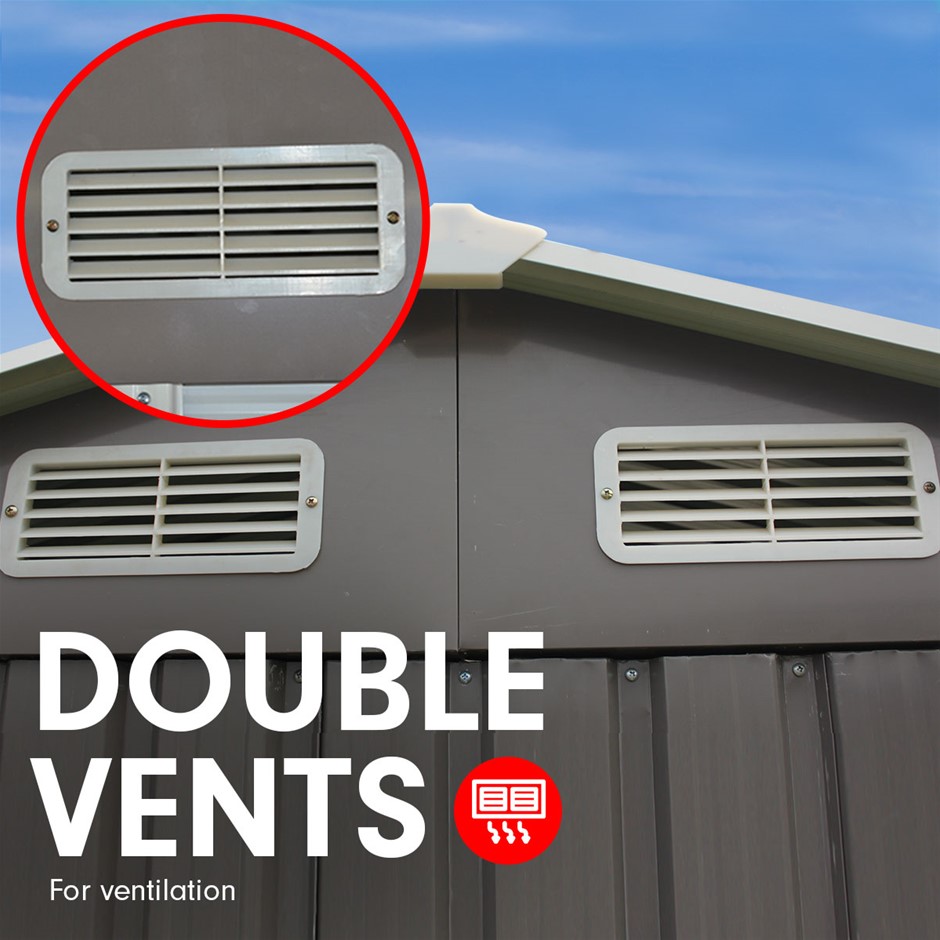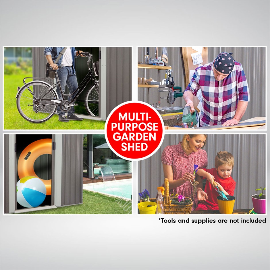 The perfect solution to all your backyard storage needs, the 4ft x 6ft garden storage shed is big enough to store just about anything! This spacious structure is just what you need to store your do-it-yourself projects, work tables, lawn and garden equipment, off-season storage household items, and more.Constructed from galvanized steel and polypropylene this sturdy shed is weather and rust-resistant and designed to withstand the harshest weather elements. It features ventilation vents to let in air and natural light.Along with reducing clutter in your home, the steel storage shed makes garden and yard work easier while protecting your expensive tools from misplacing.FEATURES: