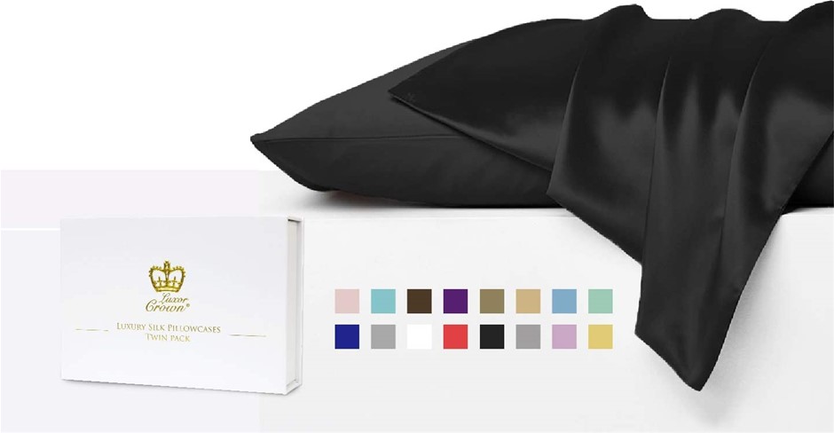 LUXOR CROWN 2pk (Twin Pack) Set Of Luxury Mulberry Silk Pillowcases, Black.