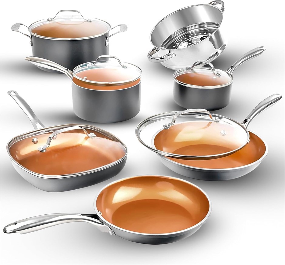GOTHAM 12 Piece Ceramic Seel Pots & Pans Set, Copper. NB: Very minor scuff