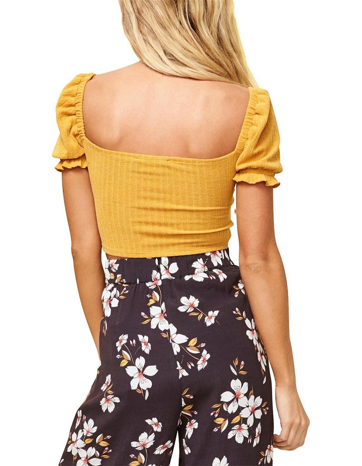 MINK PINK Gracie Tie Front Rib Top. Size L, Colour: Mustard. Buyers Note - Lot No: 0057-5061858 |