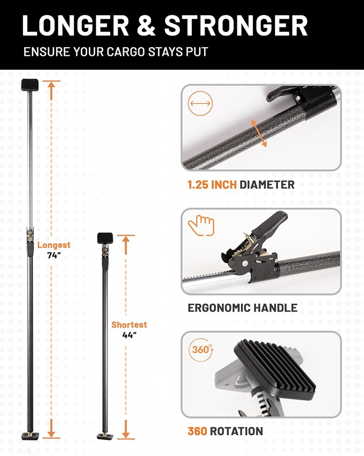 STRAPINNO Ratcheting Cargo Bar 44"-74" - Non-Slip Truck Bed Divider, Easy S
