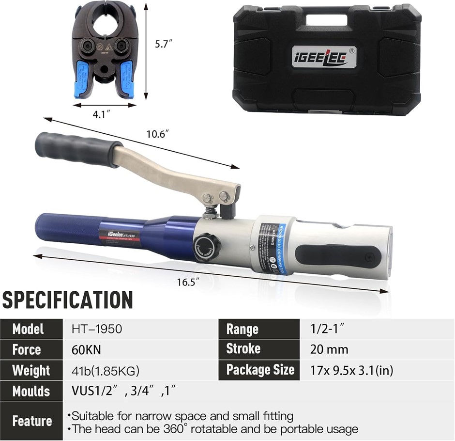 IGEELEE Hydraulic Copper Pipe Press Tool with 1/2",3/4" and 1" Dies for Vie
