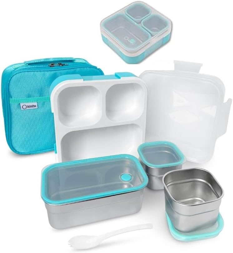 2 x KINSHO 3-Compartment Bento Box w/ Spoon (Light Teal Blue).