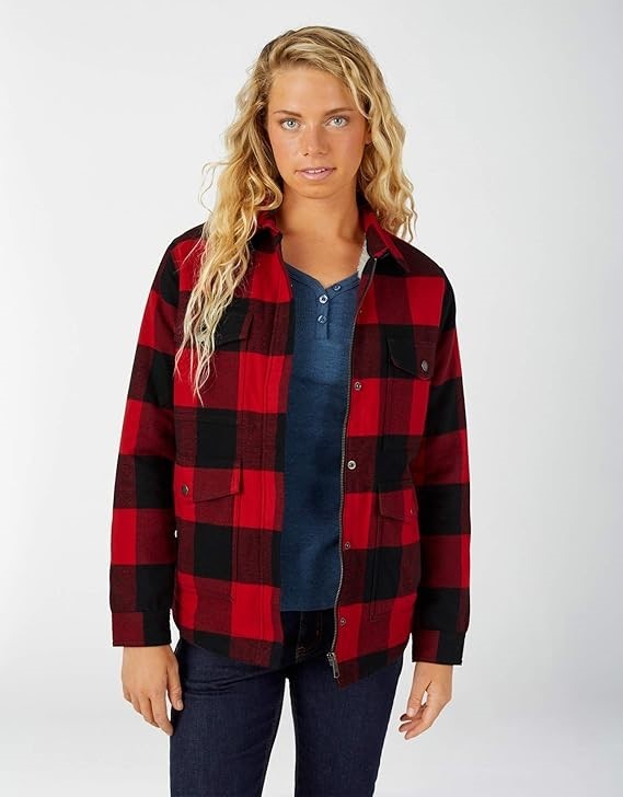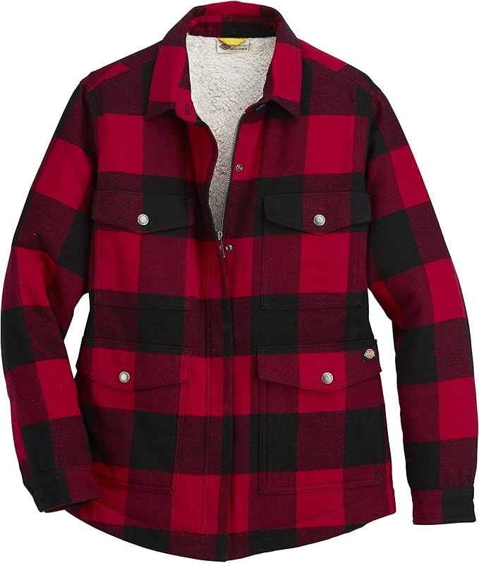 DICKIES Women's Flannel Sherpa Lined Chore Coat, Red/Black, Size M.