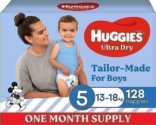 HUGGIES Ultra Dry Nappies Boys Size 5 (13-18kg) 128 Count, One Month Supply